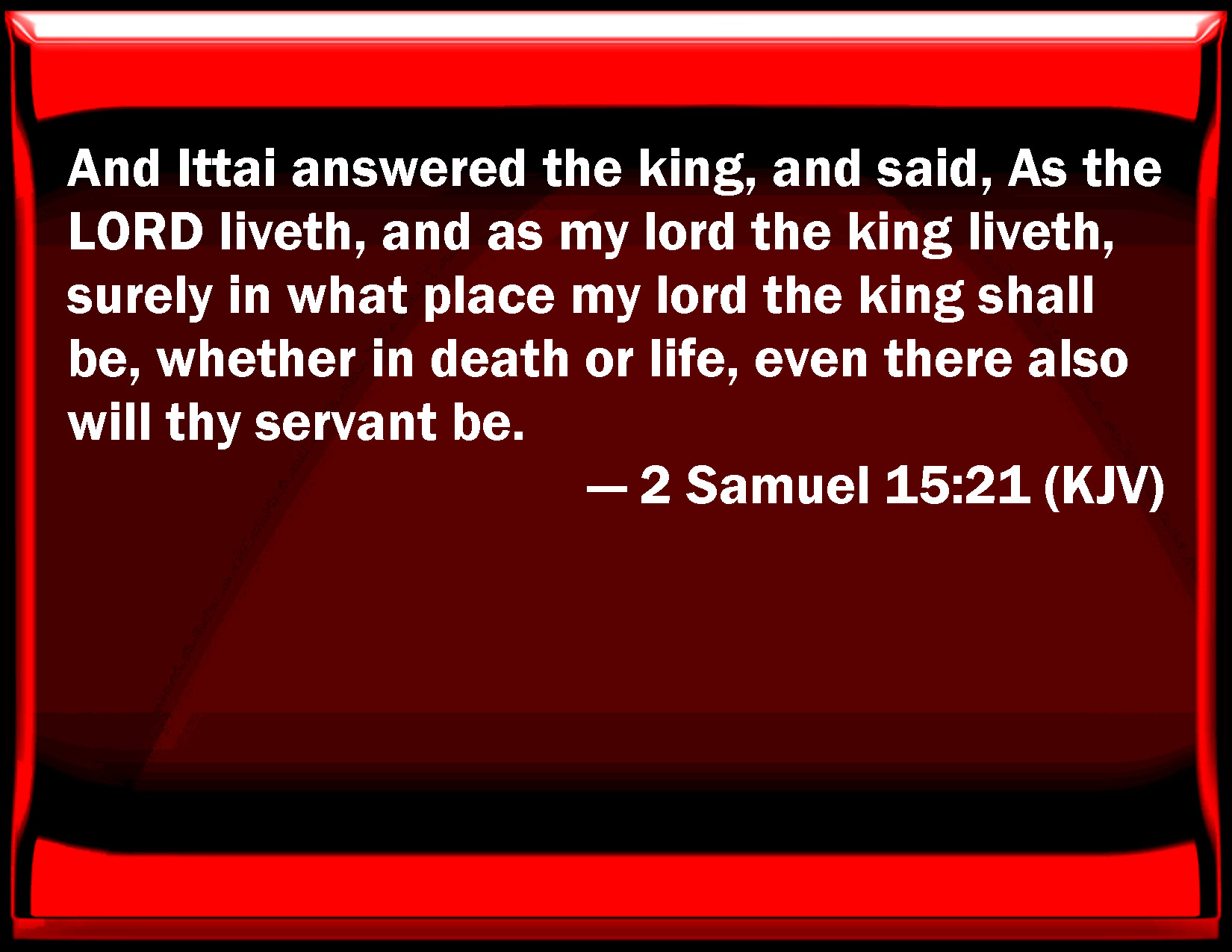 Bible Verse Slide 2 Samuel 15:21 And Ittai answered the king, and said, As the LORD lives, and as my lord the king lives, surely in what place my lord the king shall be, whether in death or life, even there also will your servant be. KJV: And Ittai answered the king, and said, As the LORD liveth, and as my lord the king liveth, surely in what place my lord the king shall be, whether in death or life, even there also will thy servant be. DRB: And Ethai answered the king, saying: As the Lord liveth, and as my lord the king liveth: in what place soever thou shalt be, my lord, O king, either in death, or in life, there will thy servant be. DBT: And Ittai answered the king and said, As Jehovah liveth, and as my lord the king liveth, surely in what place my lord the king shall be, whether in death or life, even there also will thy servant be. ERV: And Ittai answered the king, and said, As the LORD liveth, and as my lord the king liveth, surely in what place my lord the king shall be, whether for death or for life, even there also will thy servant be. WBT: And Ittai answered the king, and said, As the LORD liveth, and as my lord the king liveth, surely in what place my lord the king shall be, whether in death or life, even there also will thy servant be. WEB: Ittai answered the king, and said, "As Yahweh lives, and as my lord the king lives, surely in what place my lord the king shall is, whether for death or for life, even there also will your servant be." YLT: And Ittai answereth the king and saith, 'Jehovah liveth, and my lord the king liveth, surely in the place where my lord the king is — if for death, if for life, surely there is thy servant.'Links 2 Samuel 15:21 NIV • 2 Samuel 15:21 NLT • 2 Samuel 15:21 ESV • 2 Samuel 15:21 NASB • 2 Samuel 15:21 KJV • 2 Samuel 15:21 Interlinear • 2 Samuel 15:21 Commentaries • 2 Samuel 15:21 Parallel Texts • 2 Samuel 15:21 Bible Apps • 2 Samuel 15:21 Parallel • Bible Hub |