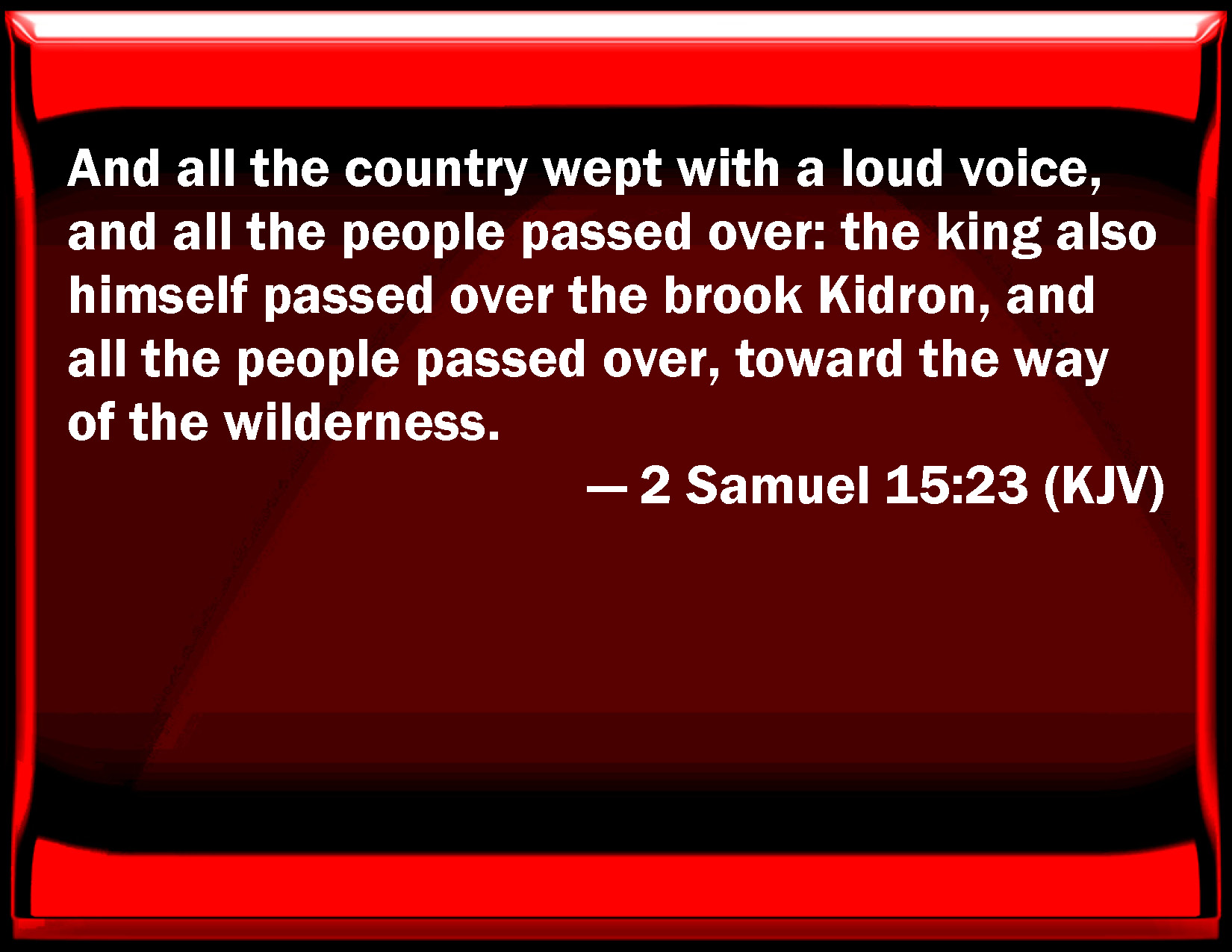 Bible Verse Slide 2 Samuel 15:23 And all the country wept with a loud voice, and all the people passed over: the king also himself passed over the brook Kidron, and all the people passed over, toward the way of the wilderness. KJV: And all the country wept with a loud voice, and all the people passed over: the king also himself passed over the brook Kidron, and all the people passed over, toward the way of the wilderness. DRB: And they all wept with a loud voice, and all the people passed over: the king also himself went over the brook Cedron, and all the people marched towards the way that looketh to the desert. DBT: And all the country wept with a loud voice, and all the people passed over; the king also himself passed over the torrent Kidron, and all the people passed over, towards the way of the wilderness. ERV: And all the country wept with a loud voice, and all the people passed over: the king also himself passed over the brook Kidron, and all the people passed over, toward the way of the wilderness. WBT: And all the country wept with a loud voice, and all the people passed over: the king also himself passed over the brook Kidron, and all the people passed over, towards the way of the wilderness. WEB: All the country wept with a loud voice, and all the people passed over: the king also himself passed over the brook Kidron, and all the people passed over, toward the way of the wilderness. YLT: And all the land are weeping — a great voice, and all the people are passing over; and the king is passing over through the brook Kidron, and all the people are passing over on the front of the way of the wilderness;Links 2 Samuel 15:23 NIV • 2 Samuel 15:23 NLT • 2 Samuel 15:23 ESV • 2 Samuel 15:23 NASB • 2 Samuel 15:23 KJV • 2 Samuel 15:23 Interlinear • 2 Samuel 15:23 Commentaries • 2 Samuel 15:23 Parallel Texts • 2 Samuel 15:23 Bible Apps • 2 Samuel 15:23 Parallel • Bible Hub |