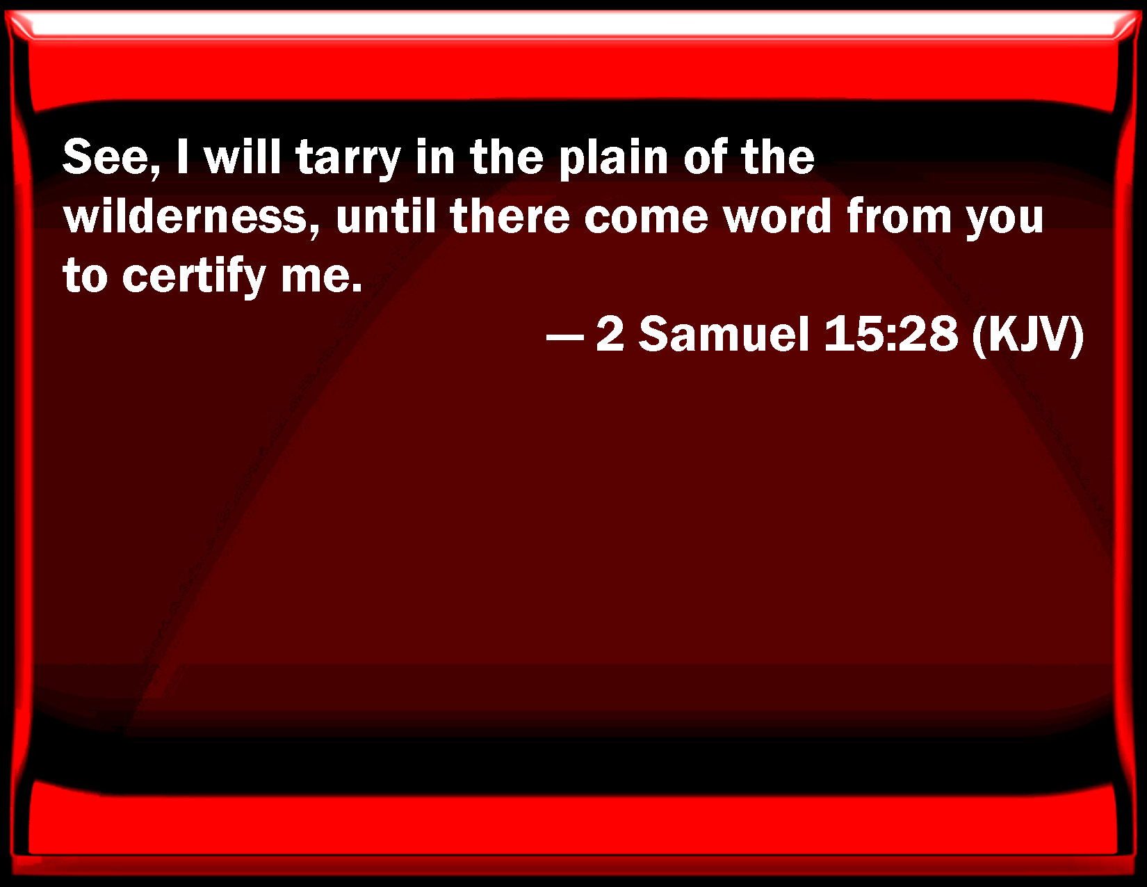 Bible Verse Slide 2 Samuel 15:28 See, I will tarry in the plain of the wilderness, until there come word from you to certify me. KJV: See, I will tarry in the plain of the wilderness, until there come word from you to certify me. DRB: Behold I will lie hid in the plains of the wilderness, till there come word from you to certify me. DBT: See, I will stop in the plains of the desert, until there come word from you to inform me. ERV: See, I will tarry at the fords of the wilderness, until there come word from you to certify me. WBT: See, I will tarry in the plain of the wilderness, until word shall come from you to certify me. WEB: Behold, I will stay at the fords of the wilderness, until word comes from you to inform me." YLT: see ye, I am tarrying in the plains of the wilderness till the coming in of a word from you to declare to me.'Links 2 Samuel 15:28 NIV • 2 Samuel 15:28 NLT • 2 Samuel 15:28 ESV • 2 Samuel 15:28 NASB • 2 Samuel 15:28 KJV • 2 Samuel 15:28 Interlinear • 2 Samuel 15:28 Commentaries • 2 Samuel 15:28 Parallel Texts • 2 Samuel 15:28 Bible Apps • 2 Samuel 15:28 Parallel • Bible Hub |