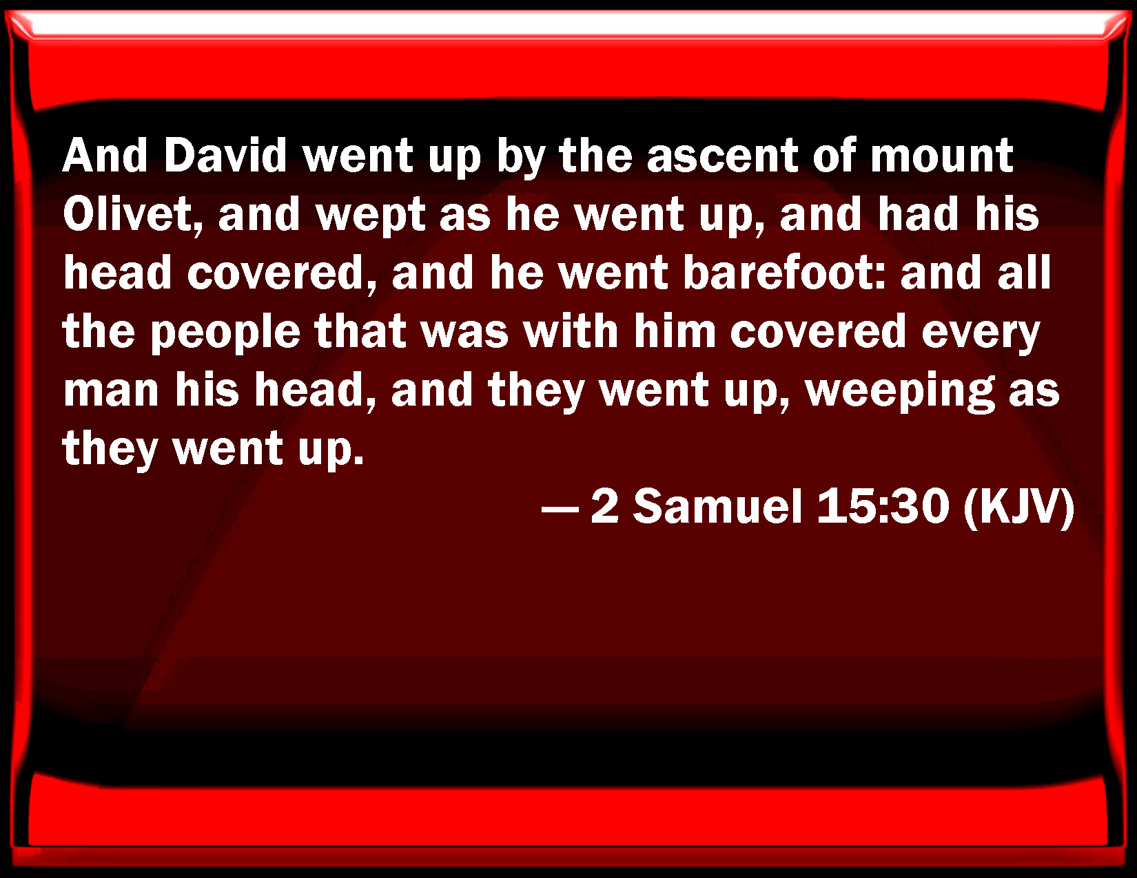 WBT:  And David went up by the ascent of mount Olivet, and wept as he went, and had his head covered, and he went barefoot: and all the people that were with him covered every man his head, and they went up, weeping as they went.