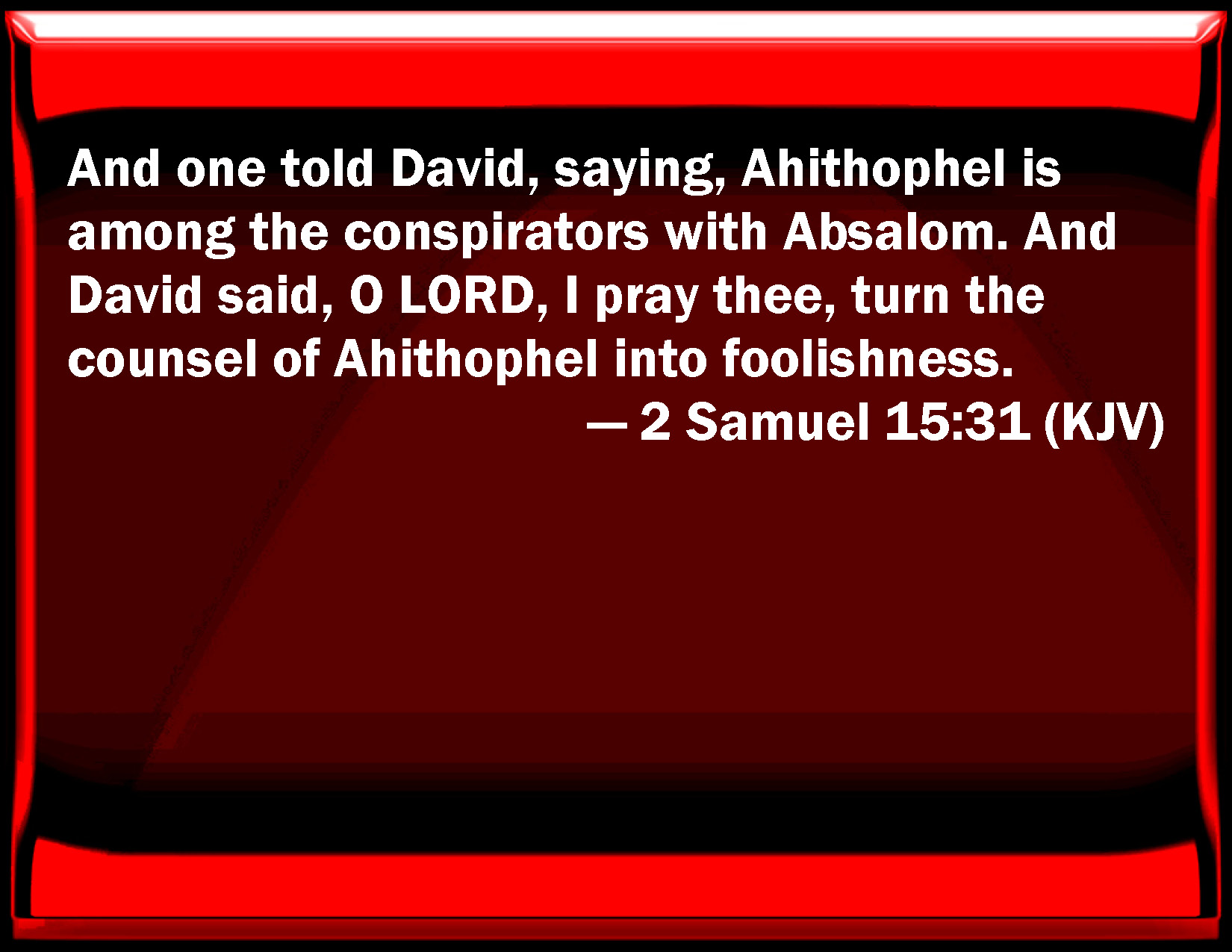 Bible Verse Slide 2 Samuel 15:31 And one told David, saying, Ahithophel is among the conspirators with Absalom. And David said, O LORD, I pray you, turn the counsel of Ahithophel into foolishness. KJV: And one told David, saying, Ahithophel is among the conspirators with Absalom. And David said, O LORD, I pray thee, turn the counsel of Ahithophel into foolishness. DRB: And it was told David that Achitophel also was in the conspiracy with Absalom, and David said: Infatuate, O Lord, I beseech thee, the counsel of Achitophel. DBT: And one told David saying, Ahithophel is among the conspirators with Absalom. Then said David, Jehovah, I pray thee, turn the counsel of Ahithophel into foolishness. ERV: And one told David, saying, Ahithophel is among the conspirators with Absalom. And David said, O LORD, I pray thee, turn the counsel of Ahithophel into foolishness. WBT: And one told David, saying, Ahithophel is among the conspirators with Absalom. And David said, O LORD, I pray thee, turn the counsel of Ahithophel into foolishness. WEB: Someone told David, saying, "Ahithophel is among the conspirators with Absalom." David said, "Yahweh, please turn the counsel of Ahithophel into foolishness." YLT: and David declared, saying, 'Ahithophel is among the conspirators with Absalom;' and David saith, 'Make foolish, I pray Thee, the counsel of Ahithophel, O Jehovah.'Links 2 Samuel 15:31 NIV • 2 Samuel 15:31 NLT • 2 Samuel 15:31 ESV • 2 Samuel 15:31 NASB • 2 Samuel 15:31 KJV • 2 Samuel 15:31 Interlinear • 2 Samuel 15:31 Commentaries • 2 Samuel 15:31 Parallel Texts • 2 Samuel 15:31 Bible Apps • 2 Samuel 15:31 Parallel • Bible Hub |