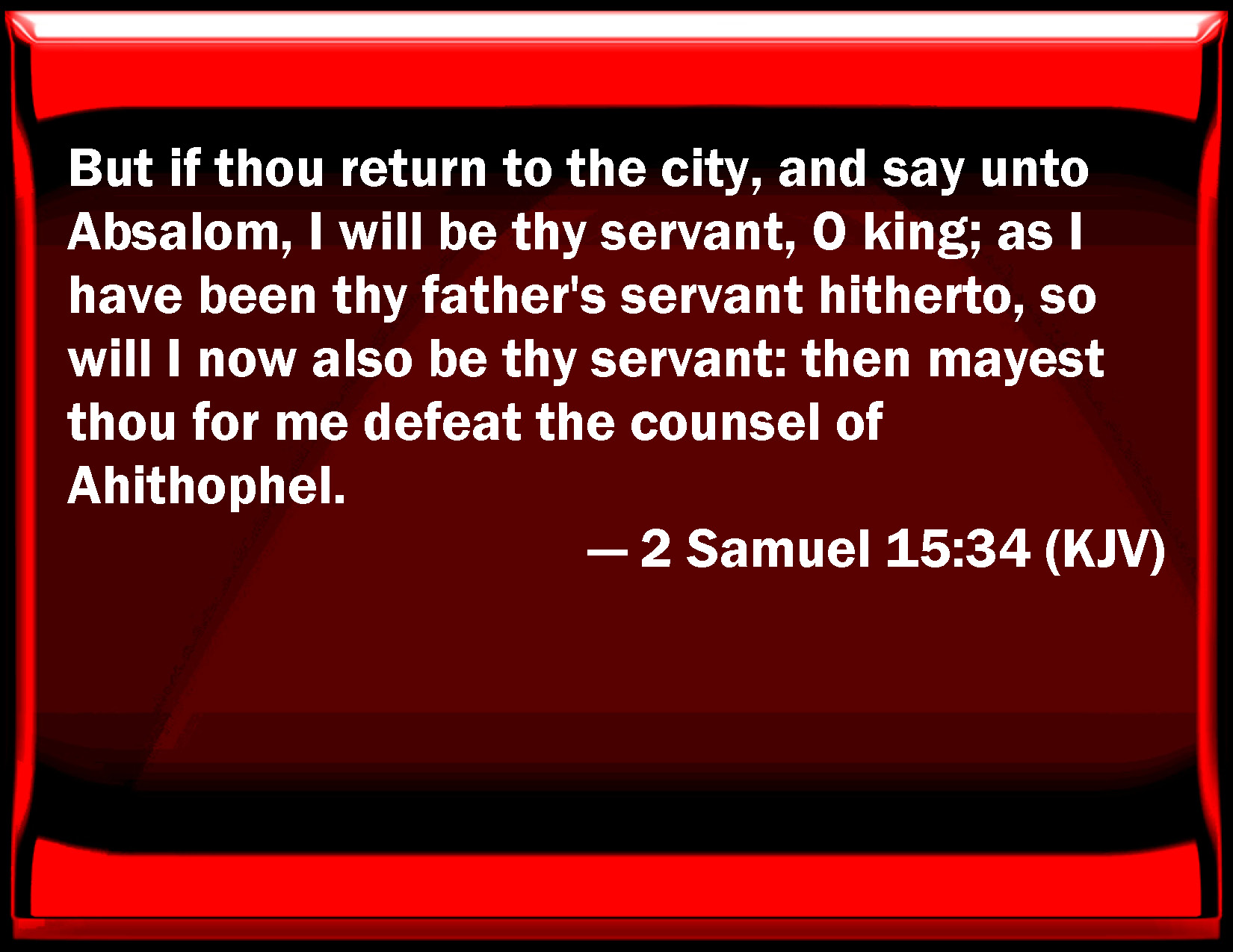 Bible Verse Slide 2 Samuel 15:34 But if you return to the city, and say to Absalom, I will be your servant, O king; as I have been your father's servant till now, so will I now also be your servant: then may you for me defeat the counsel of Ahithophel. KJV: But if thou return to the city, and say unto Absalom, I will be thy servant, O king; as I have been thy father's servant hitherto, so will I now also be thy servant: then mayest thou for me defeat the counsel of Ahithophel. DRB: But if thou return into the city, and wilt say to Absalom: I am thy servant, O king: as I have been thy father's servant, so I will be thy servant: thou shalt defeat the counsel of Achitophel. DBT: but if thou return to the city, and say to Absalom, I will be thy servant, O king; as I have been thy father's servant hitherto, so now will I be thy servant; then mayest thou for me defeat the counsel of Ahithophel. ERV: but if thou return to the city, and say unto Absalom, I will be thy servant, O king; as I have been thy father's servant in time past, so will I now be thy servant: then shalt thou defeat for me the counsel of Ahithophel. WBT: But if thou shalt return to the city, and say to Absalom, I will be thy servant, O king; as I have been thy father's servant hitherto, so will I now also be thy servant: then mayest thou for me defeat the counsel of Ahithophel. WEB: but if you return to the city, and tell Absalom, 'I will be your servant, O king. As I have been your father's servant in time past, so will I now be your servant; then will you defeat for me the counsel of Ahithophel.' YLT: and if to the city thou dost turn back, and hast said to Absalom, Thy servant I am, O king; servant of thy father I am also hitherto, and now, I am also thy servant; then thou hast made void for me the counsel of Ahithophel;Links 2 Samuel 15:34 NIV • 2 Samuel 15:34 NLT • 2 Samuel 15:34 ESV • 2 Samuel 15:34 NASB • 2 Samuel 15:34 KJV • 2 Samuel 15:34 Interlinear • 2 Samuel 15:34 Commentaries • 2 Samuel 15:34 Parallel Texts • 2 Samuel 15:34 Bible Apps • 2 Samuel 15:34 Parallel • Bible Hub |