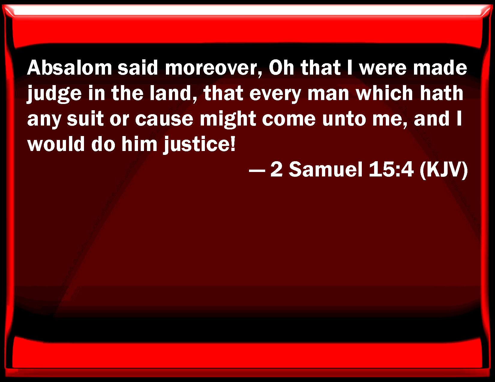 Bible Verse Slide 2 Samuel 15:4 Absalom said moreover, Oh that I were made judge in the land, that every man which has any suit or cause might come to me, and I would do him justice! KJV: Absalom said moreover, Oh that I were made judge in the land, that every man which hath any suit or cause might come unto me, and I would do him justice! DRB: O that they would make me judge over the land, that all that have business might come to me, that I might do them justice. DBT: And Absalom said, Oh that I were made judge in the land, that every man who has any controversy and cause might come to me, and I would do him justice! ERV: Absalom said moreover, Oh that I were made judge in the land, that every man which hath any suit or cause might come unto me, and I would do him justice! WBT: Absalom said moreover, Oh that I were made judge in the land, that every man who hath any suit or cause might come to me, and I would do him justice! WEB: Absalom said moreover, "Oh that I were made judge in the land, that every man who has any suit or cause might come to me, and I would do him justice!" YLT: And Absalom saith, 'Who doth make me a judge in the land, that unto me doth come every man who hath a plea and judgment? — then I have declared him righteous.'Links 2 Samuel 15:4 NIV • 2 Samuel 15:4 NLT • 2 Samuel 15:4 ESV • 2 Samuel 15:4 NASB • 2 Samuel 15:4 KJV • 2 Samuel 15:4 Interlinear • 2 Samuel 15:4 Commentaries • 2 Samuel 15:4 Parallel Texts • 2 Samuel 15:4 Bible Apps • 2 Samuel 15:4 Parallel • Bible Hub |