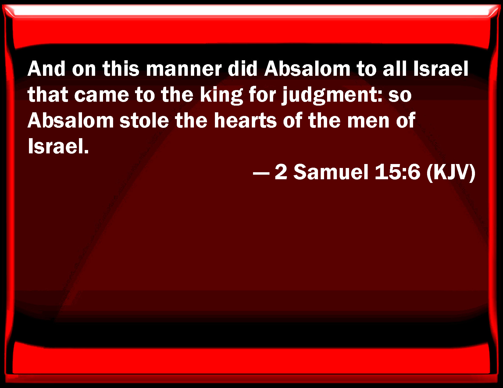 2 Samuel 15:6 And on this manner did Absalom to all Israel that came to the king for judgment: so Absalom stole the hearts of the men of Israel.