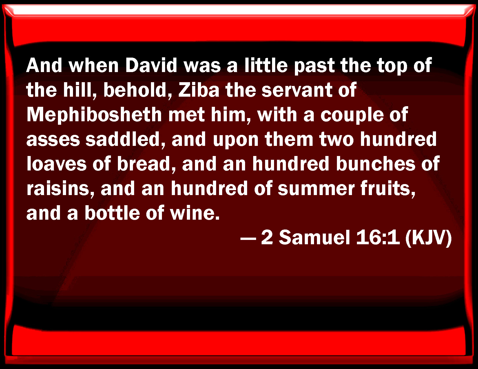 Bible Verse Slide 2 Samuel 16:1 And when David was a little past the top of the hill, behold, Ziba the servant of Mephibosheth met him, with a couple of asses saddled, and on them two hundred loaves of bread, and an hundred bunches of raisins, and an hundred of summer fruits, and a bottle of wine. KJV: And when David was a little past the top of the hill, behold, Ziba the servant of Mephibosheth met him, with a couple of asses saddled, and upon them two hundred loaves of bread, and an hundred bunches of raisins, and an hundred of summer fruits, and a bottle of wine. DRB: And when David was a little past the top of the hill, behold Siba the servant of Miphiboseth came to meet him with two asses, laden with two hundred loaves of bread, and a hundred bunches of raisins, a hundred cakes of figs, and a vessel of wine. DBT: And when David was a little past the summit, behold, Ziba, Mephibosheth's servant, met him, with a couple of asses saddled, and upon them two hundred loaves of bread, and a hundred raisin-cakes, and a hundred cakes of summer fruits, and a flask of wine. ERV: And when David was a little past the top of the ascent, behold, Ziba the servant of Mephibosheth met him, with a couple of asses saddled, and upon them two hundred loaves of bread, and an hundred clusters of raisins, and an hundred of summer fruits, and a bottle of wine. WBT: And when David was a little past the top of the hill, behold, Ziba the servant of Mephibosheth met him, with a couple of asses saddled, and upon them two hundred loaves of bread, and a hundred bunches of raisins, and a hundred of summer fruits, and a bottle of wine. WEB: When David was a little past the top [of the ascent], behold, Ziba the servant of Mephibosheth met him, with a couple of donkeys saddled, and on them two hundred loaves of bread, and one hundred clusters of raisins, and one hundred summer fruits, and a bottle of wine. YLT: And David hath passed on a little from the top, and lo, Ziba, servant of Mephibosheth — to meet him, and a couple of asses saddled, and upon them two hundred loaves, and a hundred bunches of raisins, and a hundred of summer-fruit, and a bottle of wine.Links 2 Samuel 16:1 NIV • 2 Samuel 16:1 NLT • 2 Samuel 16:1 ESV • 2 Samuel 16:1 NASB • 2 Samuel 16:1 KJV • 2 Samuel 16:1 Interlinear • 2 Samuel 16:1 Commentaries • 2 Samuel 16:1 Parallel Texts • 2 Samuel 16:1 Bible Apps • 2 Samuel 16:1 Parallel • Bible Hub |