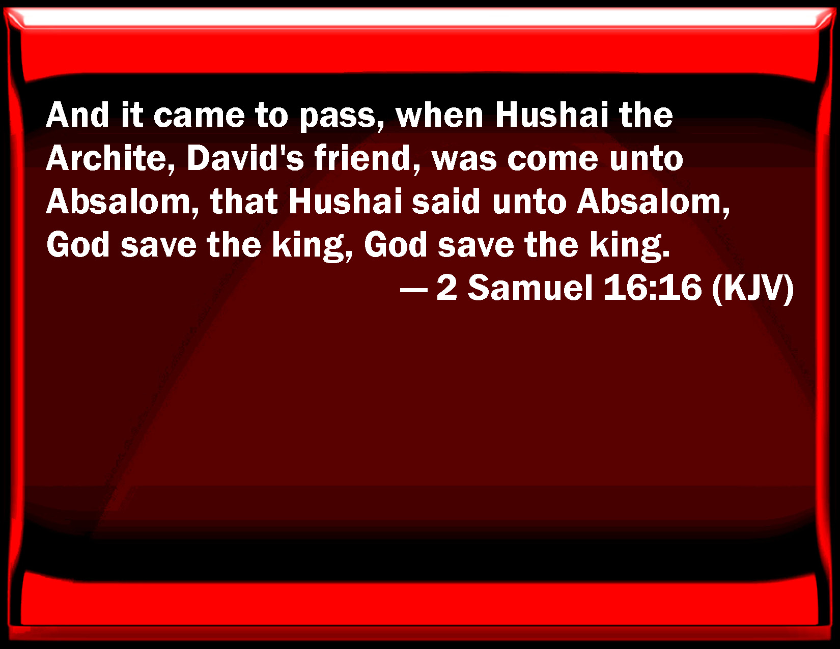 Bible Verse Slide 2 Samuel 16:16 And it came to pass, when Hushai the Archite, David's friend, was come to Absalom, that Hushai said to Absalom, God save the king, God save the king. KJV: And it came to pass, when Hushai the Archite, David's friend, was come unto Absalom, that Hushai said unto Absalom, God save the king, God save the king. DRB: And when Chusai the Arachite, David's friend, was come to Absalom, he said to him: God save thee, O king, God save thee, O king. DBT: And it came to pass, when Hushai the Archite, David's friend, came to Absalom, that Hushai said to Absalom, Long live the king! Long live the king! ERV: And it came to pass, when Hushai the Archite, David's friend, was come unto Absalom, that Hushai said unto Absalom, God save the king, God save the king. WBT: And it came to pass, when Hushai the Archite, David's friend, had come to Absalom, that Hushai said to Absalom, God save the king, God save the king. WEB: It happened, when Hushai the Archite, David's friend, had come to Absalom, that Hushai said to Absalom, "Long live the king! Long live the king!" YLT: and it cometh to pass, when Hushai the Archite, David's friend, hath come unto Absalom, that Hushai saith unto Absalom, 'Let the king live! let the king live!'Links 2 Samuel 16:16 NIV • 2 Samuel 16:16 NLT • 2 Samuel 16:16 ESV • 2 Samuel 16:16 NASB • 2 Samuel 16:16 KJV • 2 Samuel 16:16 Interlinear • 2 Samuel 16:16 Commentaries • 2 Samuel 16:16 Parallel Texts • 2 Samuel 16:16 Bible Apps • 2 Samuel 16:16 Parallel • Bible Hub |