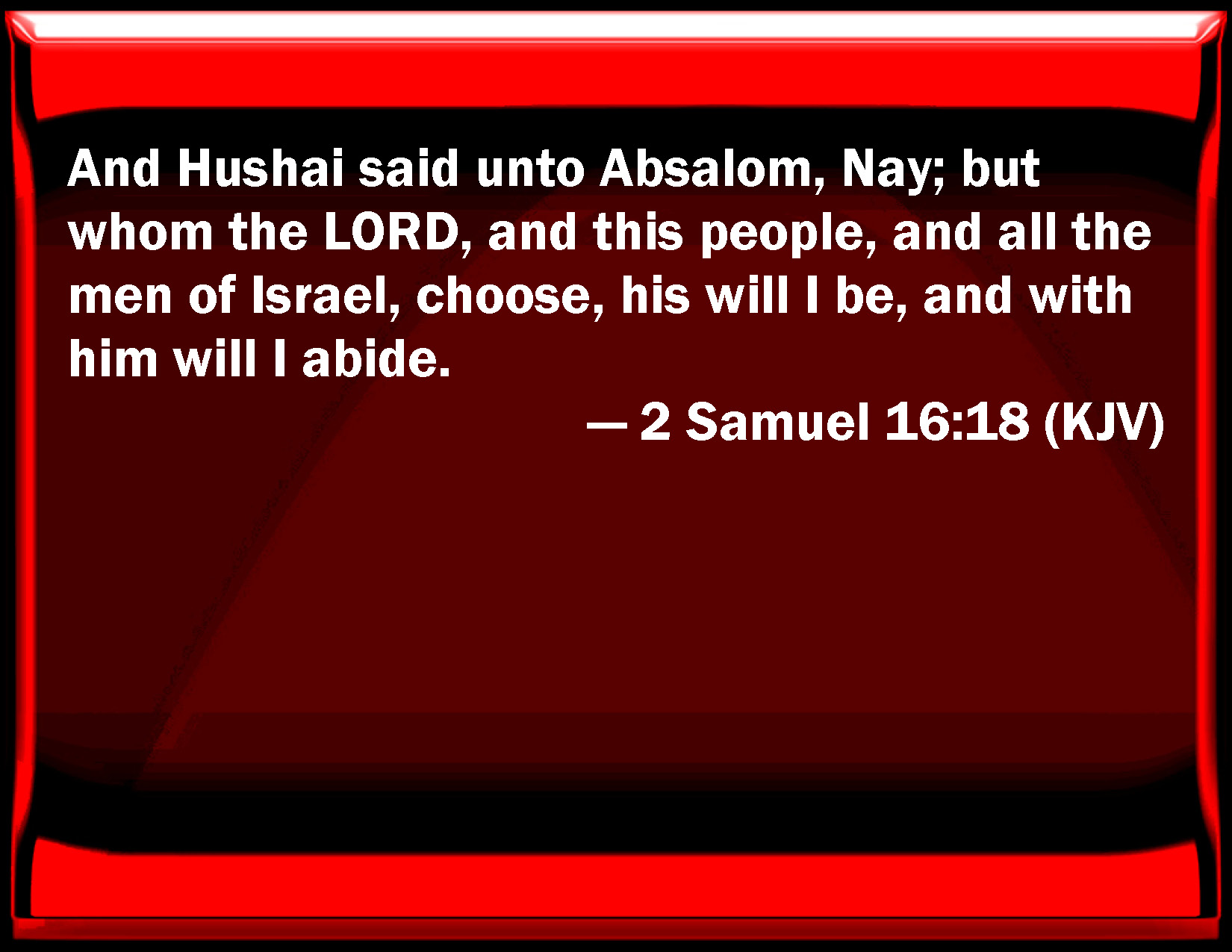 Bible Verse Slide 2 Samuel 16:18 And Hushai said to Absalom, No; but whom the LORD, and this people, and all the men of Israel, choose, his will I be, and with him will I abide. KJV: And Hushai said unto Absalom, Nay; but whom the LORD, and this people, and all the men of Israel, choose, his will I be, and with him will I abide. DRB: And Chusai answered Absalom: Nay: for I will be his, whom the Lord hath chosen, and all this people, and all Israel, and with him will I abide. DBT: And Hushai said to Absalom, No; but whom Jehovah, and this people, and all the men of Israel choose, his will I be, and with him will I abide. ERV: And Hushai said unto Absalom, Nay; but whom the LORD, and this people, and all the men of Israel have chosen, his will I be, and with him will I abide. WBT: And Hushai said to Absalom, Nay; but whom the LORD, and this people, and all the men of Israel choose, his will I be, and with him will I abide. WEB: Hushai said to Absalom, "No; but whoever Yahweh, and this people, and all the men of Israel have chosen, his will I be, and with him I will stay. YLT: And Hushai saith unto Absalom, 'Nay, for he whom Jehovah hath chosen, and this people, even all the men of Israel, his I am, and with him I abide;Links 2 Samuel 16:18 NIV • 2 Samuel 16:18 NLT • 2 Samuel 16:18 ESV • 2 Samuel 16:18 NASB • 2 Samuel 16:18 KJV • 2 Samuel 16:18 Interlinear • 2 Samuel 16:18 Commentaries • 2 Samuel 16:18 Parallel Texts • 2 Samuel 16:18 Bible Apps • 2 Samuel 16:18 Parallel • Bible Hub |