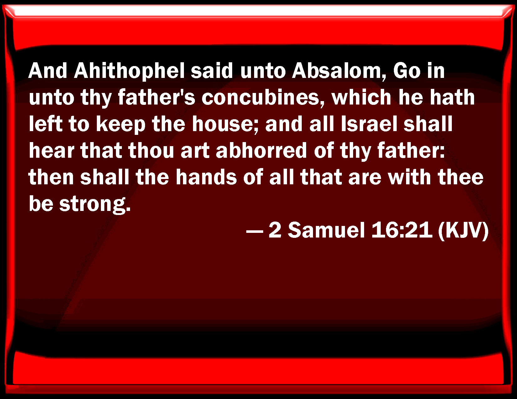 Bible Verse Slide 2 Samuel 16:21 And Ahithophel said to Absalom, Go in to your father's concubines, which he has left to keep the house; and all Israel shall hear that you are abhorred of your father: then shall the hands of all that are with you be strong. KJV: And Ahithophel said unto Absalom, Go in unto thy father's concubines, which he hath left to keep the house; and all Israel shall hear that thou art abhorred of thy father: then shall the hands of all that are with thee be strong. DRB: And Achitophel said to Absalom: Go in to the concubines of thy father, whom he hath left to keep the house: that when all Israel shall hear that thou hast disgraced thy father, their hands may be strengthened with thee. DBT: And Ahithophel said to Absalom, Go in to thy father's concubines, whom he has left to keep the house; and all Israel shall hear that thou art become odious with thy father; and the hands of all that are with thee shall be strong. ERV: And Ahithophel said unto Absalom, Go in unto thy father's concubines, which he hath left to keep the house; and all Israel shall hear that thou art abhorred of thy father: then shall the hands of all that are with thee be strong. WBT: And Ahithophel said to Absalom, Go in to thy father's concubines, which he hath left to keep the house; and all Israel shall hear that thou art abhorred by thy father: then shall the hands of all that are with thee be strong. WEB: Ahithophel said to Absalom, "Go in to your father's concubines, that he has left to keep the house. Then all Israel will hear that you are abhorred by your father. Then the hands of all who are with you will be strong." YLT: And Ahithophel saith unto Absalom, 'Go in unto the concubines of thy father, whom he left to keep the house, and all Israel hath heard that thou hast been abhorred by thy father, and the hands of all who are with thee have been strong.'Links 2 Samuel 16:21 NIV • 2 Samuel 16:21 NLT • 2 Samuel 16:21 ESV • 2 Samuel 16:21 NASB • 2 Samuel 16:21 KJV • 2 Samuel 16:21 Interlinear • 2 Samuel 16:21 Commentaries • 2 Samuel 16:21 Parallel Texts • 2 Samuel 16:21 Bible Apps • 2 Samuel 16:21 Parallel • Bible Hub |