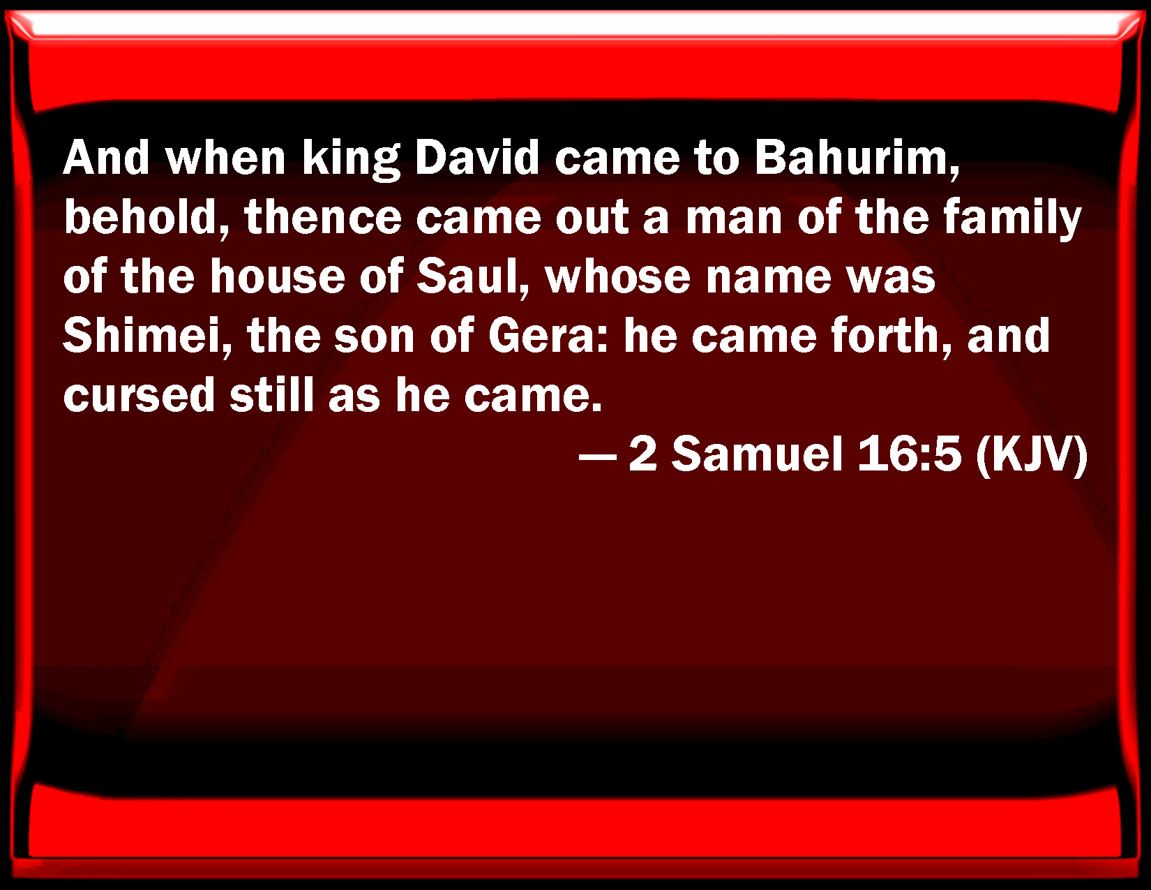 Bible Verse Slide 2 Samuel 16:5 And when king David came to Bahurim, behold, there came out a man of the family of the house of Saul, whose name was Shimei, the son of Gera: he came forth, and cursed still as he came. KJV: And when king David came to Bahurim, behold, thence came out a man of the family of the house of Saul, whose name was Shimei, the son of Gera: he came forth, and cursed still as he came. DRB: And king David came as far as Bahurim: and behold there came out from thence a man of the kindred of the house of Saul named Semei, the son of Gera, and coming out he cursed as he went on, DBT: And when king David came to Bahurim, behold, there came out from thence a man of the family of the house of Saul, whose name was Shimei, the son of Gera: he came forth, and cursed, ERV: And when king David came to Bahurim, behold, there came out thence a man of the family of the house of Saul, whose name was Shimei, the son of Gera: he came out, and cursed still as he came. WBT: And when king David came to Bahurim, behold, thence came out a man of the family of the house of Saul, whose name was Shimei, the son of Gera: he came forth, and cursed still as he came. WEB: When king David came to Bahurim, behold, a man of the family of the house of Saul came out, whose name was Shimei, the son of Gera. He came out, and cursed still as he came. YLT: And king David hath come in unto Bahurim, and lo, thence a man is coming out, of the family of the house of Saul, and his name is Shimei, son of Gera, he cometh out, coming out and reviling;Links 2 Samuel 16:5 NIV • 2 Samuel 16:5 NLT • 2 Samuel 16:5 ESV • 2 Samuel 16:5 NASB • 2 Samuel 16:5 KJV • 2 Samuel 16:5 Interlinear • 2 Samuel 16:5 Commentaries • 2 Samuel 16:5 Parallel Texts • 2 Samuel 16:5 Bible Apps • 2 Samuel 16:5 Parallel • Bible Hub |