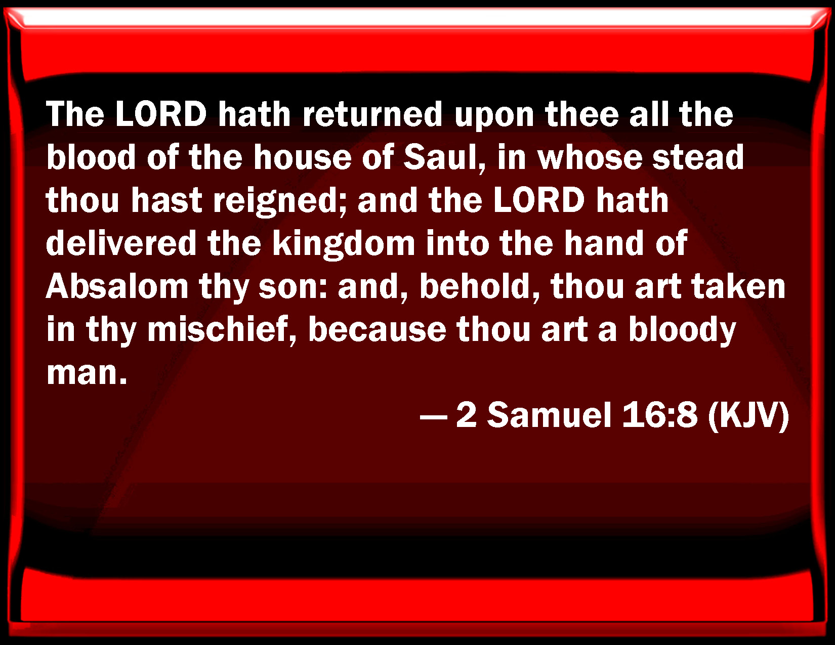 Bible Verse Slide 2 Samuel 16:8 The LORD has returned on you all the blood of the house of Saul, in whose stead you have reigned; and the LORD has delivered the kingdom into the hand of Absalom your son: and, behold, you are taken in your mischief, because you are a bloody man. KJV: The LORD hath returned upon thee all the blood of the house of Saul, in whose stead thou hast reigned; and the LORD hath delivered the kingdom into the hand of Absalom thy son: and, behold, thou art taken in thy mischief, because thou art a bloody man. DRB: The Lord hath repaid thee for all the blood of the house of Saul: because thou hast usurped the kingdom in his stead, and the Lord hath given the kingdom into the hand of Absalom thy son: and behold thy evils press upon thee, because thou art a man of blood. DBT: Jehovah has returned upon thee all the blood of the house of Saul, in whose stead thou hast reigned; and Jehovah has given the kingdom into the hand of Absalom thy son; and behold, thou art taken in thine own evil, for thou art a man of blood. ERV: The LORD hath returned upon thee all the blood of the house of Saul, in whose stead thou hast reigned; and the LORD hath delivered the kingdom into the hand of Absalom thy son: and, behold, thou art taken in thine own mischief, because thou art a man of blood. WBT: The LORD hath returned upon thee all the blood of the house of Saul, in whose stead thou hast reigned; and the LORD hath delivered the kingdom into the hand of Absalom thy son: and behold, thou art taken in thy mischief, because thou art a bloody man. WEB: Yahweh has returned on you all the blood of the house of Saul, in whose place you have reigned! Yahweh has delivered the kingdom into the hand of Absalom your son! Behold, you are caught by your own mischief, because you are a man of blood!" YLT: Jehovah hath turned back on thee all the blood of the house of Saul, in whose stead thou hast reigned, and Jehovah doth give the kingdom in to the hand of Absalom thy son; and lo, thou art in thine evil, for a man of blood thou art.'Links 2 Samuel 16:8 NIV • 2 Samuel 16:8 NLT • 2 Samuel 16:8 ESV • 2 Samuel 16:8 NASB • 2 Samuel 16:8 KJV • 2 Samuel 16:8 Interlinear • 2 Samuel 16:8 Commentaries • 2 Samuel 16:8 Parallel Texts • 2 Samuel 16:8 Bible Apps • 2 Samuel 16:8 Parallel • Bible Hub |