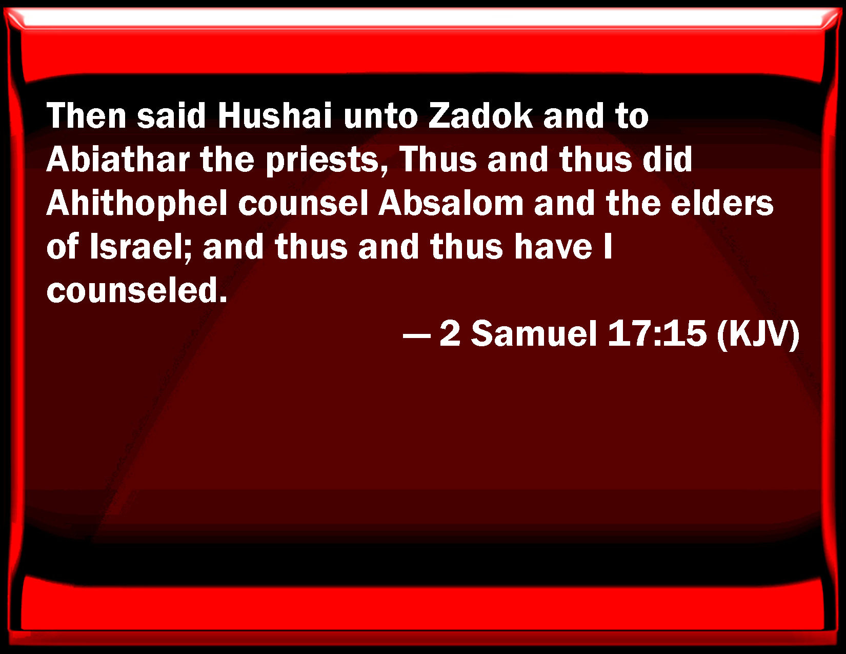 Then said Hushai unto Zadok and to Abiathar the priests. Thus and thus did Ahithophel counsel Absalom and the elders of Israel; and thus and thus have I counselled.