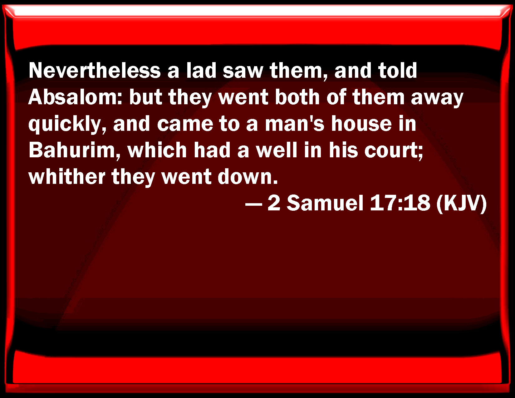 Bible Verse Slide 2 Samuel 17:18 Nevertheless a lad saw them, and told Absalom: but they went both of them away quickly, and came to a man's house in Bahurim, which had a well in his court; where they went down. KJV: Nevertheless a lad saw them, and told Absalom: but they went both of them away quickly, and came to a man's house in Bahurim, which had a well in his court; whither they went down. DRB: But a certain boy saw them, and told Absalom: but they making haste went into the house of a certain man in Bahurim, who had a well in his court, and they went down into it. DBT: But a lad saw them, and told Absalom. Then they went both of them away quickly, and came to the house of a man at Bahurim, who had a well in his court; and they went down there. ERV: But a lad saw them, and told Absalom: and they went both of them away quickly, and came to the house of a man in Bahurim, who had a well in his court; and they went down thither. WBT: Nevertheless, a lad saw them, and told Absalom: but they went both of them away quickly, and came to the house of a man in Bahurim, who had a well in his court; into which they descended. WEB: But a boy saw them, and told Absalom. Then they both went away quickly, and came to the house of a man in Bahurim, who had a well in his court; and they went down there. YLT: And a youth seeth them, and declareth to Absalom; and they go on both of them hastily, and come in unto the house of a man in Bahurim, and he hath a well in his court, and they go down there,Links 2 Samuel 17:18 NIV • 2 Samuel 17:18 NLT • 2 Samuel 17:18 ESV • 2 Samuel 17:18 NASB • 2 Samuel 17:18 KJV • 2 Samuel 17:18 Interlinear • 2 Samuel 17:18 Commentaries • 2 Samuel 17:18 Parallel Texts • 2 Samuel 17:18 Bible Apps • 2 Samuel 17:18 Parallel • Bible Hub |