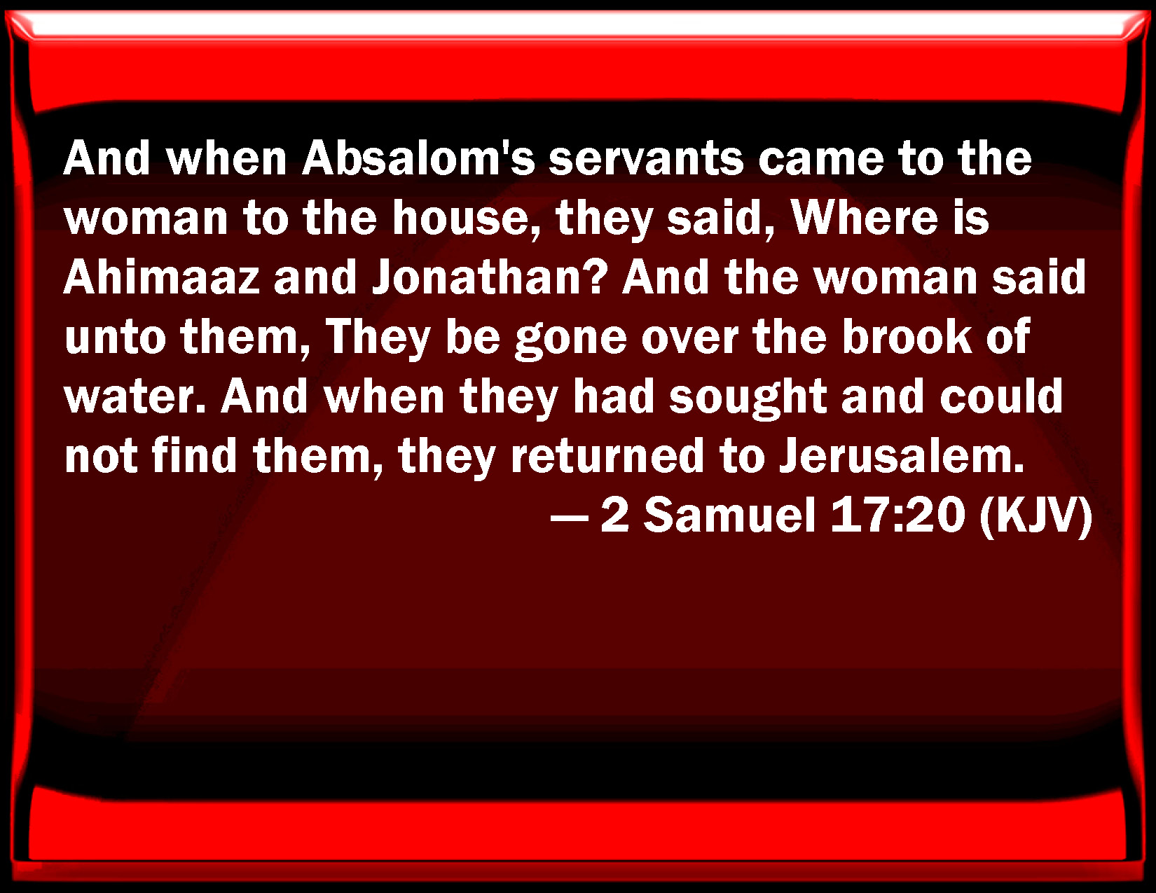 Bible Verse Slide 2 Samuel 17:20 And when Absalom's servants came to the woman to the house, they said, Where is Ahimaaz and Jonathan? And the woman said to them, They be gone over the brook of water. And when they had sought and could not find them, they returned to Jerusalem. KJV: And when Absalom's servants came to the woman to the house, they said, Where is Ahimaaz and Jonathan? And the woman said unto them, They be gone over the brook of water. And when they had sought and could not find them, they returned to Jerusalem. DRB: And when Absalom's servants were come into the house, they said to the woman: Where is Achimaas and Jonathan? and the woman answered them: They passed on in haste, after they had tasted a little water. But they that sought them, when they found them not, returned into Jerusalem. DBT: And Absalom's servants came to the woman to the house, and said, Where are Ahimaaz and Jonathan? And the woman said to them, They have gone over the brook of water. And they sought and could not find them, and returned to Jerusalem. ERV: And Absalom's servants came to the woman to the house; and they said, Where are Ahimaaz and Jonathan? And the woman said unto them, They be gone over the brook of water. And when they had sought and could not find them, they returned to Jerusalem. WBT: And when Absalom's servants came to the woman to the house, they said, Where is Ahimaaz and Jonathan? And the woman said to them, they have gone over the brook of water. And when they had sought and could not find them, they returned to Jerusalem. WEB: Absalom's servants came to the woman to the house; and they said, "Where are Ahimaaz and Jonathan?" The woman said to them, "They have gone over the brook of water." When they had sought and could not find them, they returned to Jerusalem. YLT: And the servants of Absalom come in unto the woman to the house, and say, 'Where are Ahimaaz and Jonathan?' and the woman saith to them, 'They passed over the brook of water;' and they seek, and have not found, and turn back to Jerusalem.Links 2 Samuel 17:20 NIV • 2 Samuel 17:20 NLT • 2 Samuel 17:20 ESV • 2 Samuel 17:20 NASB • 2 Samuel 17:20 KJV • 2 Samuel 17:20 Interlinear • 2 Samuel 17:20 Commentaries • 2 Samuel 17:20 Parallel Texts • 2 Samuel 17:20 Bible Apps • 2 Samuel 17:20 Parallel • Bible Hub |