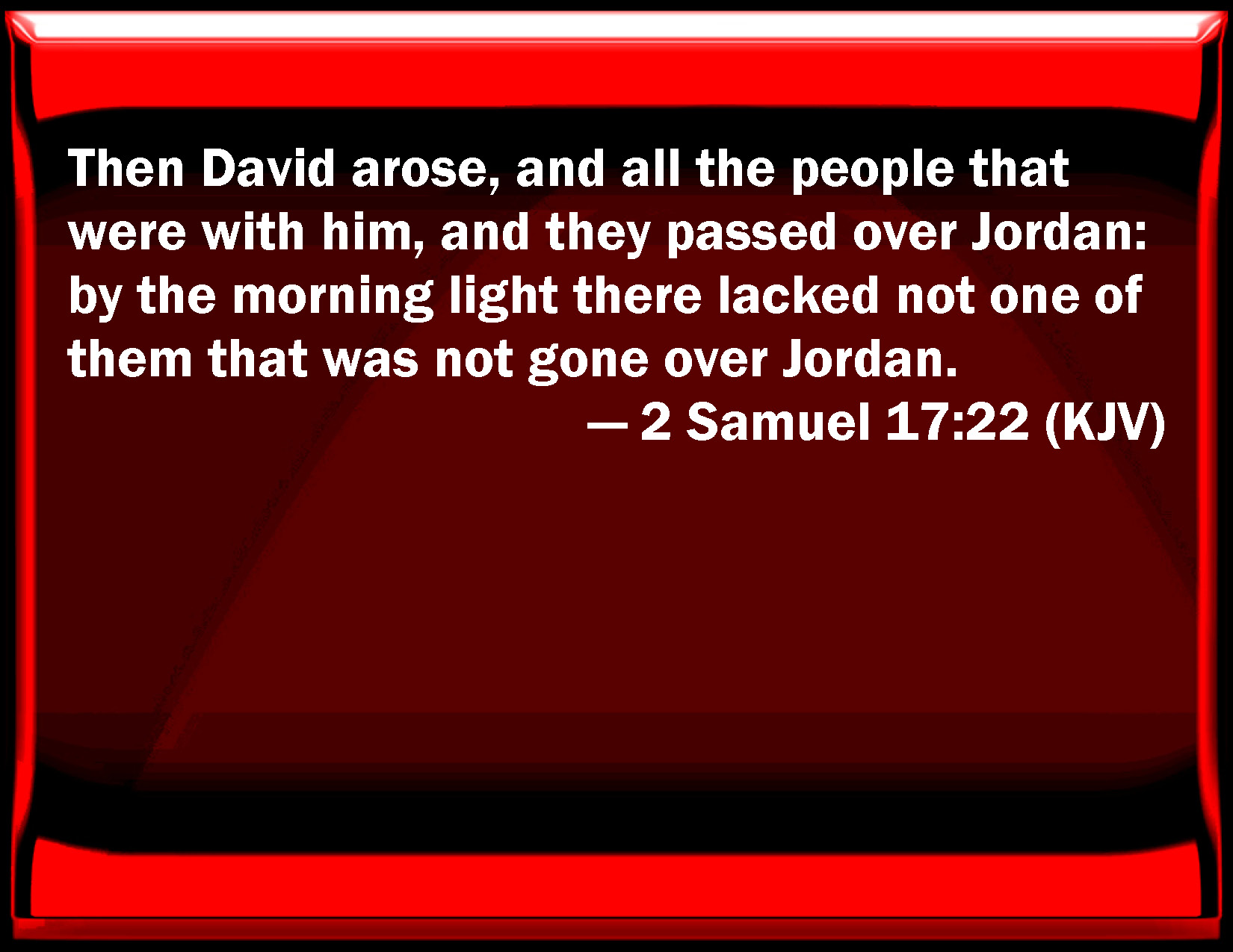 Bible Verse Slide 2 Samuel 17:22 Then David arose, and all the people that were with him, and they passed over Jordan: by the morning light there lacked not one of them that was not gone over Jordan. KJV: Then David arose, and all the people that were with him, and they passed over Jordan: by the morning light there lacked not one of them that was not gone over Jordan. DRB: So David arose, and all the people that were with him, and they passed over the Jordan, until it grew light, and not one of them was left that was not gone over the river. DBT: Then David arose, and all the people that were with him, and they passed over the Jordan; by the morning light there was not one of them missing that had not gone over the Jordan. ERV: Then David arose, and all the people that were with him, and they passed over Jordan: by the morning light there lacked not one of them that was not gone over Jordan. WBT: Then David arose, and all the people that were with him, and they passed over Jordan: by the morning light there lacked not one of them that had not gone over Jordan. WEB: Then David arose, and all the people who were with him, and they passed over the Jordan. By the morning light there lacked not one of them who had not gone over the Jordan. YLT: And David riseth, and all the people who are with him, and they pass over the Jordan, till the light of the morning, till one hath not been lacking who hath not passed over the Jordan.Links 2 Samuel 17:22 NIV • 2 Samuel 17:22 NLT • 2 Samuel 17:22 ESV • 2 Samuel 17:22 NASB • 2 Samuel 17:22 KJV • 2 Samuel 17:22 Interlinear • 2 Samuel 17:22 Commentaries • 2 Samuel 17:22 Parallel Texts • 2 Samuel 17:22 Bible Apps • 2 Samuel 17:22 Parallel • Bible Hub |