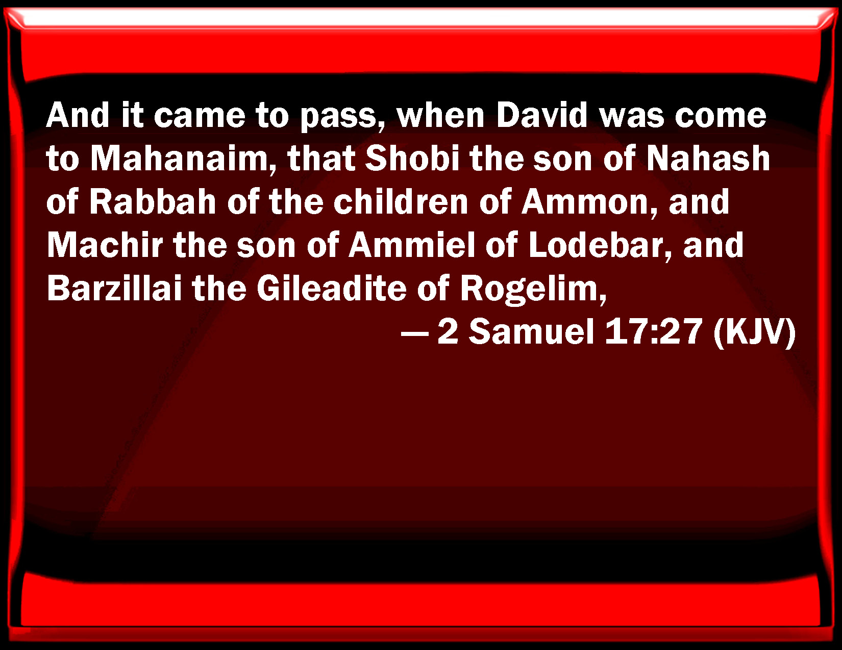Bible Verse Slide 2 Samuel 17:27 And it came to pass, when David was come to Mahanaim, that Shobi the son of Nahash of Rabbah of the children of Ammon, and Machir the son of Ammiel of Lodebar, and Barzillai the Gileadite of Rogelim, KJV: And it came to pass, when David was come to Mahanaim, that Shobi the son of Nahash of Rabbah of the children of Ammon, and Machir the son of Ammiel of Lodebar, and Barzillai the Gileadite of Rogelim, DRB: And when David was come to the camp, Sobi the son of Naas of Rabbath of the children of Ammon, and Machir the son of Ammihel of Lodabar, and Berzellai the Galaadite of Rogelim, DBT: And as soon as David came to Mahanaim, Shobi the son of Nahash of Rabbah of the children of Ammon, and Machir the son of Ammiel of Lo-debar, and Barzillai the Gileadite of Rogelim, ERV: And it came to pass, when David was come to Mahanaim, that Shobi the son of Nahash of Rabbah of the children of Ammon, and Machir the son of Ammiel of Lo-debar, and Barzillai the Gileadite of Rogelim, WBT: And it came to pass, when David had come to Mahanaim, that Shobi the son of Nahash of Rabbah of the children of Ammon, and Machir the son of Ammiel of Lo-debar, and Barzillai the Gileadite of Rogelim, WEB: It happened, when David was come to Mahanaim, that Shobi the son of Nahash of Rabbah of the children of Ammon, and Machir the son of Ammiel of Lodebar, and Barzillai the Gileadite of Rogelim, YLT: And it cometh to pass at the coming in of David to Mahanaim, that Shobi, son of Nahash, from Rabbah of the Bene-Ammon, and Machir son of Ammiel, from Lo-Debar, and Barzillai the Gileadite, from Rogelim,Links 2 Samuel 17:27 NIV • 2 Samuel 17:27 NLT • 2 Samuel 17:27 ESV • 2 Samuel 17:27 NASB • 2 Samuel 17:27 KJV • 2 Samuel 17:27 Interlinear • 2 Samuel 17:27 Commentaries • 2 Samuel 17:27 Parallel Texts • 2 Samuel 17:27 Bible Apps • 2 Samuel 17:27 Parallel • Bible Hub |
