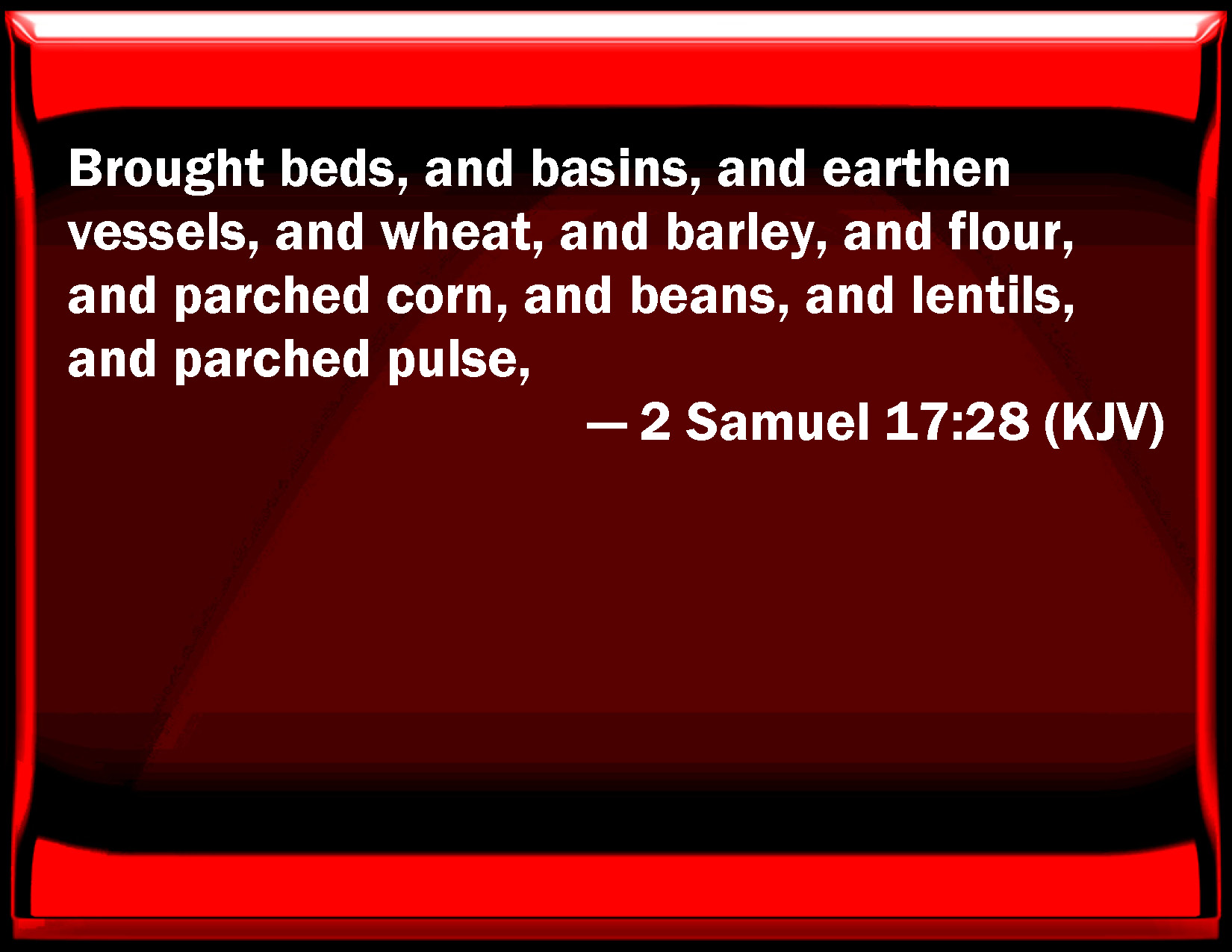 Bible Verse Slide 2 Samuel 17:28 Brought beds, and basins, and earthen vessels, and wheat, and barley, and flour, and parched corn, and beans, and lentils, and parched vegetables, KJV: Brought beds, and basons, and earthen vessels, and wheat, and barley, and flour, and parched corn, and beans, and lentiles, and parched pulse, DRB: Brought him beds, and tapestry, and earthen vessels, and wheat, and barley, and meal, and parched corn, and beans, and lentils, and fried pulse, DBT: brought beds, and basons, and earthen vessels, and wheat, and barley, and flour, and parched corn, and beans, and lentils, and parched pulse, ERV: brought beds, and basons, and earthen vessels, and wheat, and barley, and meal, and parched corn, and beans, and lentils, and parched pulse, WBT: Brought beds, and basins, and earthen vessels, and wheat, and barley, and flour, and parched corn, and beans, and lentils, and parched pulse, WEB: brought beds, and basins, and earthen vessels, and wheat, and barley, and meal, and parched [grain], and beans, and lentils, and parched [pulse], YLT: couch, and basin, and earthen vessel, and wheat, and barley, and flour, and roasted corn, and beans, and lentiles, and roasted pulse,Links 2 Samuel 17:28 NIV • 2 Samuel 17:28 NLT • 2 Samuel 17:28 ESV • 2 Samuel 17:28 NASB • 2 Samuel 17:28 KJV • 2 Samuel 17:28 Interlinear • 2 Samuel 17:28 Commentaries • 2 Samuel 17:28 Parallel Texts • 2 Samuel 17:28 Bible Apps • 2 Samuel 17:28 Parallel • Bible Hub |