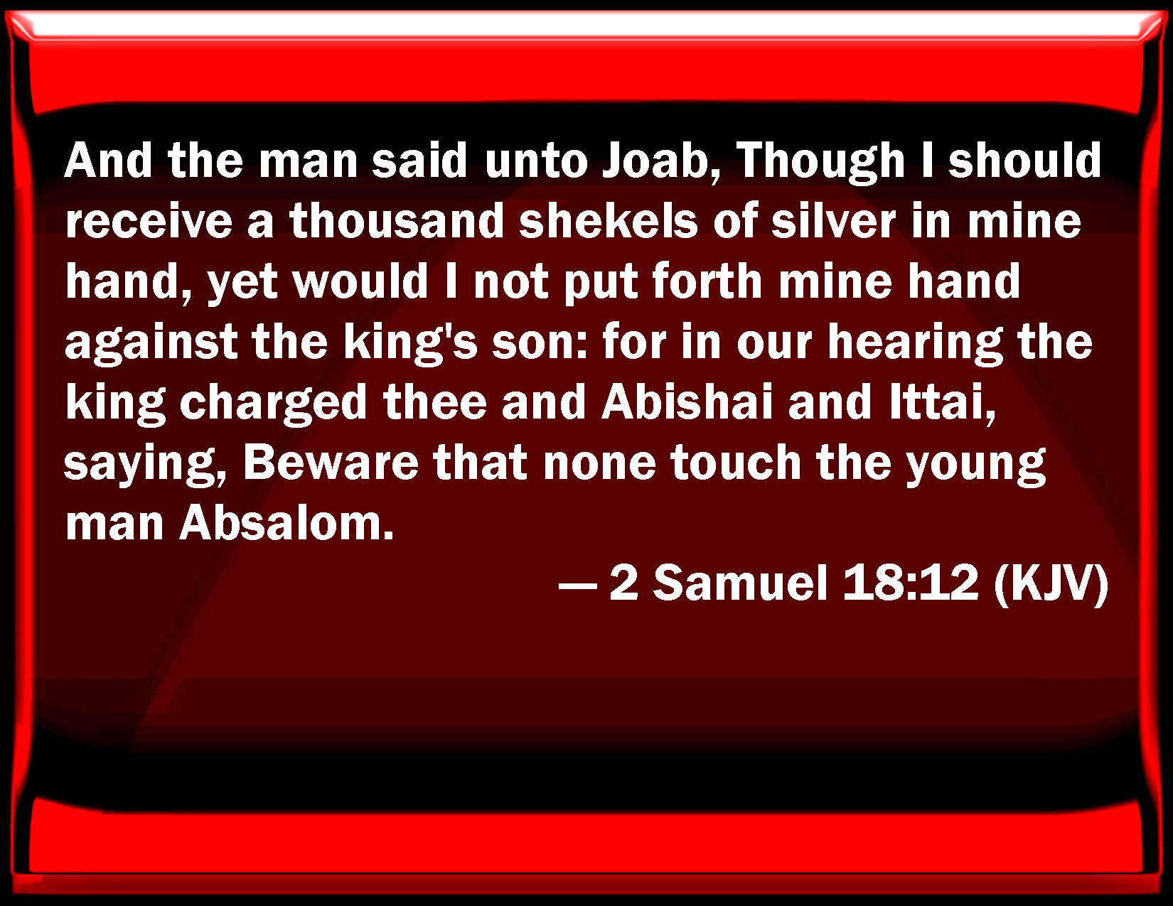 Bible Verse Slide 2 Samuel 18:12 And the man said to Joab, Though I should receive a thousand shekels of silver in my hand, yet would I not put forth my hand against the king's son: for in our hearing the king charged you and Abishai and Ittai, saying, Beware that none touch the young man Absalom. KJV: And the man said unto Joab, Though I should receive a thousand shekels of silver in mine hand, yet would I not put forth mine hand against the king's son: for in our hearing the king charged thee and Abishai and Ittai, saying, Beware that none touch the young man Absalom. DRB: And he said to Joab: If thou wouldst have paid down in my hands a thousand pieces of silver, I would not lay my hands upon the king's son: for in our hearing he king charged thee, and Abisai, and Ethai, saying: Save me the boy Absalom. DBT: And the man said to Joab, Though I should receive a thousand silver pieces in my hand, yet would I not put forth my hand against the king's son; for in our hearing the king charged thee and Abishai and Ittai, saying, Take care, whoever it be of you, of the young man Absalom. ERV: And the man said unto Joab, Though I should receive a thousand pieces of silver in mine hand, yet would I not put forth mine hand against the king's son: for in our hearing the king charged thee and Abishai and Ittai, saying, Beware that none touch the young man Absalom. WBT: And the man said to Joab, Though I should receive a thousand shekels of silver in my hand, yet would I not put forth my hand against the king's son: for in our hearing the king charged thee and Abishai and Ittai, saying, Beware that none touch the young man Absalom. WEB: The man said to Joab, "Though I should receive a thousand pieces of silver in my hand, I still wouldn't put forth my hand against the king's son; for in our hearing the king commanded you and Abishai and Ittai, saying, 'Beware that none touch the young man Absalom.' YLT: And the man saith unto Joab, 'Yea, though I am weighing on my hand a thousand silverlings, I do not put forth my hand unto the son of the king; for in our ears hath the king charged thee, and Abishai, and Ittai, saying, Observe ye who is against the youth — against Absalom;Links 2 Samuel 18:12 NIV • 2 Samuel 18:12 NLT • 2 Samuel 18:12 ESV • 2 Samuel 18:12 NASB • 2 Samuel 18:12 KJV • 2 Samuel 18:12 Interlinear • 2 Samuel 18:12 Commentaries • 2 Samuel 18:12 Parallel Texts • 2 Samuel 18:12 Bible Apps • 2 Samuel 18:12 Parallel • Bible Hub |