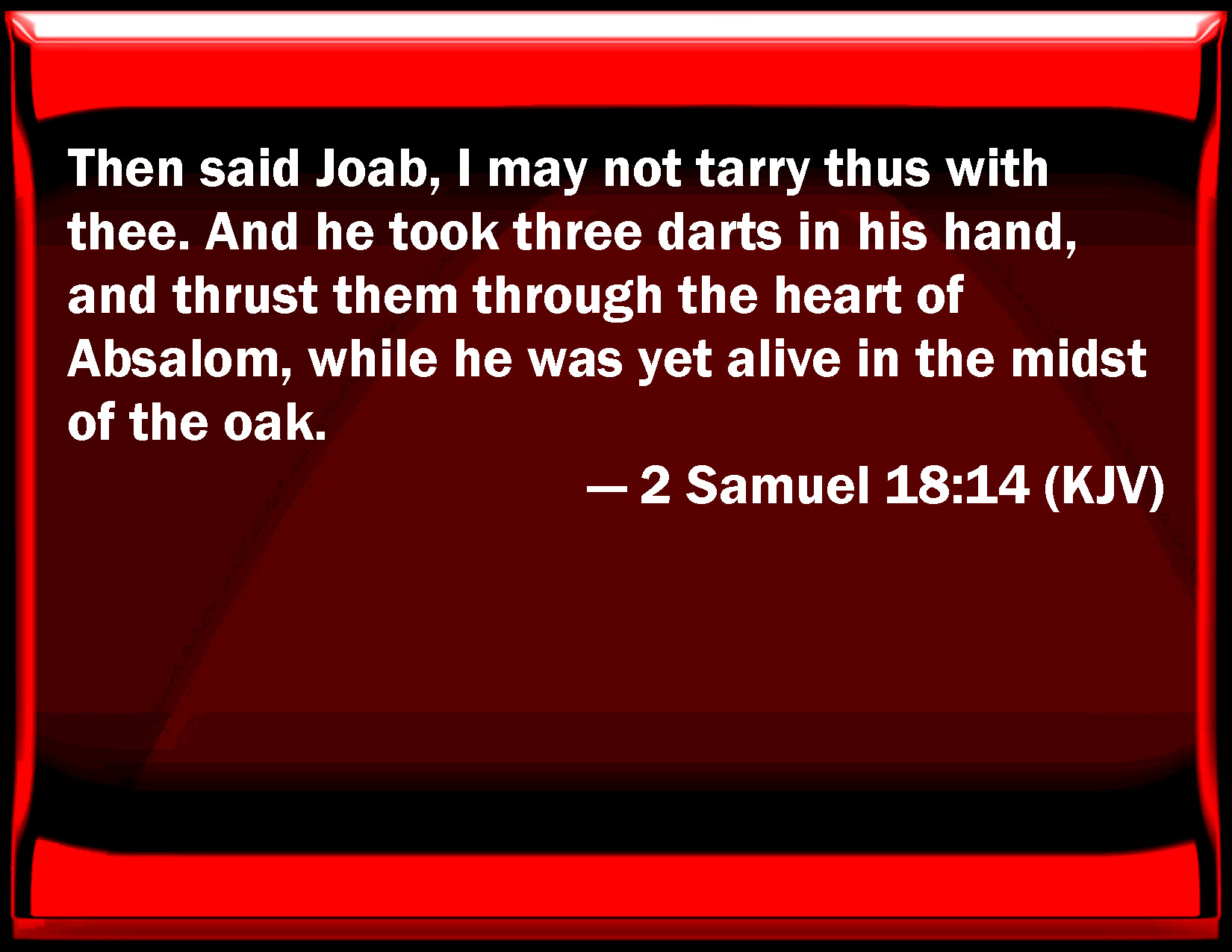 Bible Verse Slide 2 Samuel 18:14 Then said Joab, I may not tarry thus with you. And he took three darts in his hand, and thrust them through the heart of Absalom, while he was yet alive in the middle of the oak. KJV: Then said Joab, I may not tarry thus with thee. And he took three darts in his hand, and thrust them through the heart of Absalom, while he was yet alive in the midst of the oak. DRB: And Joab said: Not as thou wilt, but will set upon him in thy sight. So he took three lances in his hand, and thrust them into the heart of Absalom: and whilst he yet panted for life, sticking on the oak, DBT: Then said Joab, I may not tarry thus with thee. And he took three spears in his hand, and thrust them into Absalom's body, while he was yet alive in the midst of the terebinth. ERV: Then said Joab, I may not tarry thus with thee. And he took three darts in his hand, and thrust them through the heart of Absalom, while he was yet alive in the midst of the oak. WBT: Then said Joab, I may not tarry thus with thee. And he took three darts in his hand, and thrust them through the heart of Absalom, while he was yet alive in the midst of the oak. WEB: Then Joab said, "I'm not going to wait like this with you." He took three darts in his hand, and thrust them through the heart of Absalom, while he was yet alive in the midst of the oak. YLT: And Joab saith, 'Not right — I tarry before thee;' and he taketh three darts in his hand, and striketh them into the heart of Absalom, while he is alive, in the midst of the oak.Links 2 Samuel 18:14 NIV • 2 Samuel 18:14 NLT • 2 Samuel 18:14 ESV • 2 Samuel 18:14 NASB • 2 Samuel 18:14 KJV • 2 Samuel 18:14 Interlinear • 2 Samuel 18:14 Commentaries • 2 Samuel 18:14 Parallel Texts • 2 Samuel 18:14 Bible Apps • 2 Samuel 18:14 Parallel • Bible Hub |