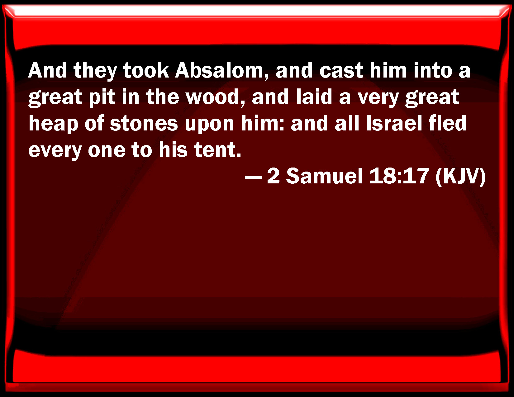 Bible Verse Slide 2 Samuel 18:17 And they took Absalom, and cast him into a great pit in the wood, and laid a very great heap of stones on him: and all Israel fled every one to his tent. KJV: And they took Absalom, and cast him into a great pit in the wood, and laid a very great heap of stones upon him: and all Israel fled every one to his tent. DRB: And they took Absalom, and cast him into a great pit in the forest, and they laid an exceeding great heap of stories upon him: but all Israel fled to their own dwellings. DBT: And they took Absalom, and cast him into a great pit in the wood, and raised a very great heap of stones upon him. And all Israel fled every one to his tent. ERV: And they took Absalom, and cast him into the great pit in the forest, and raised over him a very great heap of stones: and all Israel fled every one to his tent. WBT: And they took Absalom, and cast him into a great pit in the wood, and laid a very great heap of stones upon him: and all Israel fled every one to his tent. WEB: They took Absalom, and cast him into the great pit in the forest, and raised over him a very great heap of stones. Then all Israel fled everyone to his tent. YLT: and they take Absalom and cast him in the forest unto the great pit, and set up over him a very great heap of stones, and all Israel have fled — each to his tent.Links 2 Samuel 18:17 NIV • 2 Samuel 18:17 NLT • 2 Samuel 18:17 ESV • 2 Samuel 18:17 NASB • 2 Samuel 18:17 KJV • 2 Samuel 18:17 Interlinear • 2 Samuel 18:17 Commentaries • 2 Samuel 18:17 Parallel Texts • 2 Samuel 18:17 Bible Apps • 2 Samuel 18:17 Parallel • Bible Hub |