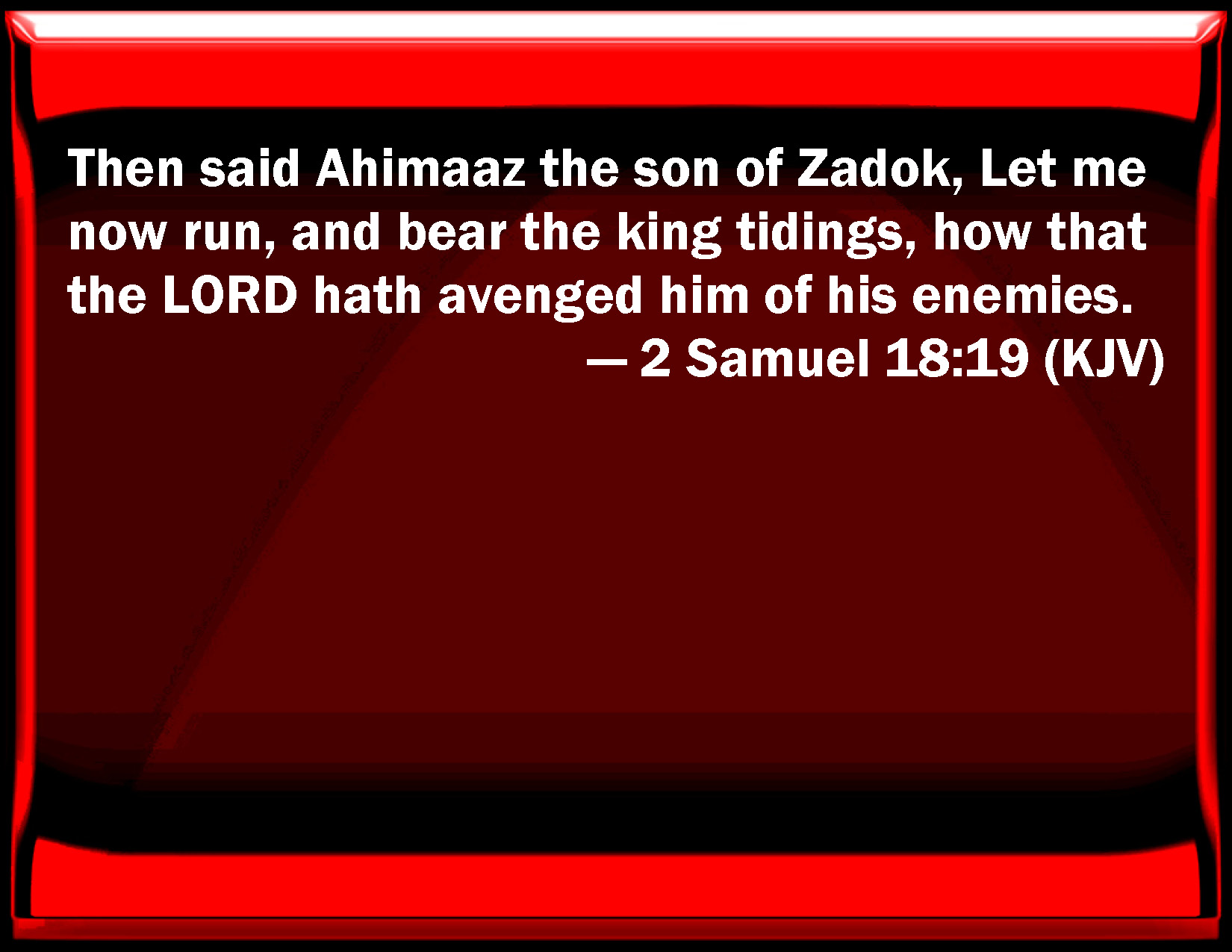Bible Verse Slide 2 Samuel 18:19 Then said Ahimaaz the son of Zadok, Let me now run, and bear the king tidings, how that the LORD has avenged him of his enemies. KJV: Then said Ahimaaz the son of Zadok, Let me now run, and bear the king tidings, how that the LORD hath avenged him of his enemies. DRB: And Achimaas the son of Sadoc said: I will run and tell the king, that the Lord hath done judgment for him from the hand of his enemies. DBT: And Ahimaaz the son of Zadok said, Let me run, I pray, and carry the king the news that Jehovah has avenged him of his enemies. ERV: Then said Ahimaaz the son of Zadok, Let me now run, and bear the king tidings, how that the LORD hath avenged him of his enemies. WBT: Then said Ahimaaz the son of Zadok, Let me now run, and inform the king, how the LORD hath avenged himself of his enemies. WEB: Then Ahimaaz the son of Zadok said, "Let me now run, and bear the king news, how that Yahweh has avenged him of his enemies." YLT: And Ahimaaz son of Zadok said, 'Let me run, I pray thee, and I bear the king tidings, for Jehovah hath delivered him out of the hand of his enemies;'Links 2 Samuel 18:19 NIV • 2 Samuel 18:19 NLT • 2 Samuel 18:19 ESV • 2 Samuel 18:19 NASB • 2 Samuel 18:19 KJV • 2 Samuel 18:19 Interlinear • 2 Samuel 18:19 Commentaries • 2 Samuel 18:19 Parallel Texts • 2 Samuel 18:19 Bible Apps • 2 Samuel 18:19 Parallel • Bible Hub |