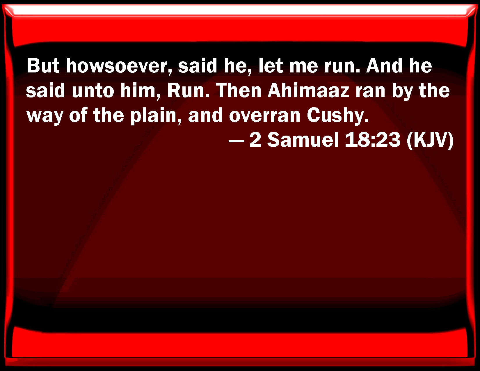 Bible Verse Slide 2 Samuel 18:23 But howsoever, said he, let me run. And he said to him, Run. Then Ahimaaz ran by the way of the plain, and overran Cushi. KJV: But howsoever, said he, let me run. And he said unto him, Run. Then Ahimaaz ran by the way of the plain, and overran Cushi. DRB: He answered: But what if I run? And he said to him: Run. Then Achimaas running by a nearer way passed Chusai. DBT: but, come what may, let me run. And he said to him, run. And Ahimaaz ran by the way of the plain, And outstripped the Cushite. ERV: But come what may, said he, I will run. And he said unto him, Run. Then Ahimaaz ran by the way of the Plain, and overran the Cushite. WBT: But however, said he, let me run. And he said to him, Run. Then Ahimaaz ran by the way of the plain, and outran Cushi. WEB: "But come what may," he said, "I will run." He said to him, "Run!" Then Ahimaaz ran by the way of the Plain, and outran the Cushite. YLT: And, whatever it be, said he, let me run.' And he saith to him, 'Run;' and Ahimaaz runneth the way of the circuit, and passeth by the Cushite.Links 2 Samuel 18:23 NIV • 2 Samuel 18:23 NLT • 2 Samuel 18:23 ESV • 2 Samuel 18:23 NASB • 2 Samuel 18:23 KJV • 2 Samuel 18:23 Interlinear • 2 Samuel 18:23 Commentaries • 2 Samuel 18:23 Parallel Texts • 2 Samuel 18:23 Bible Apps • 2 Samuel 18:23 Parallel • Bible Hub |