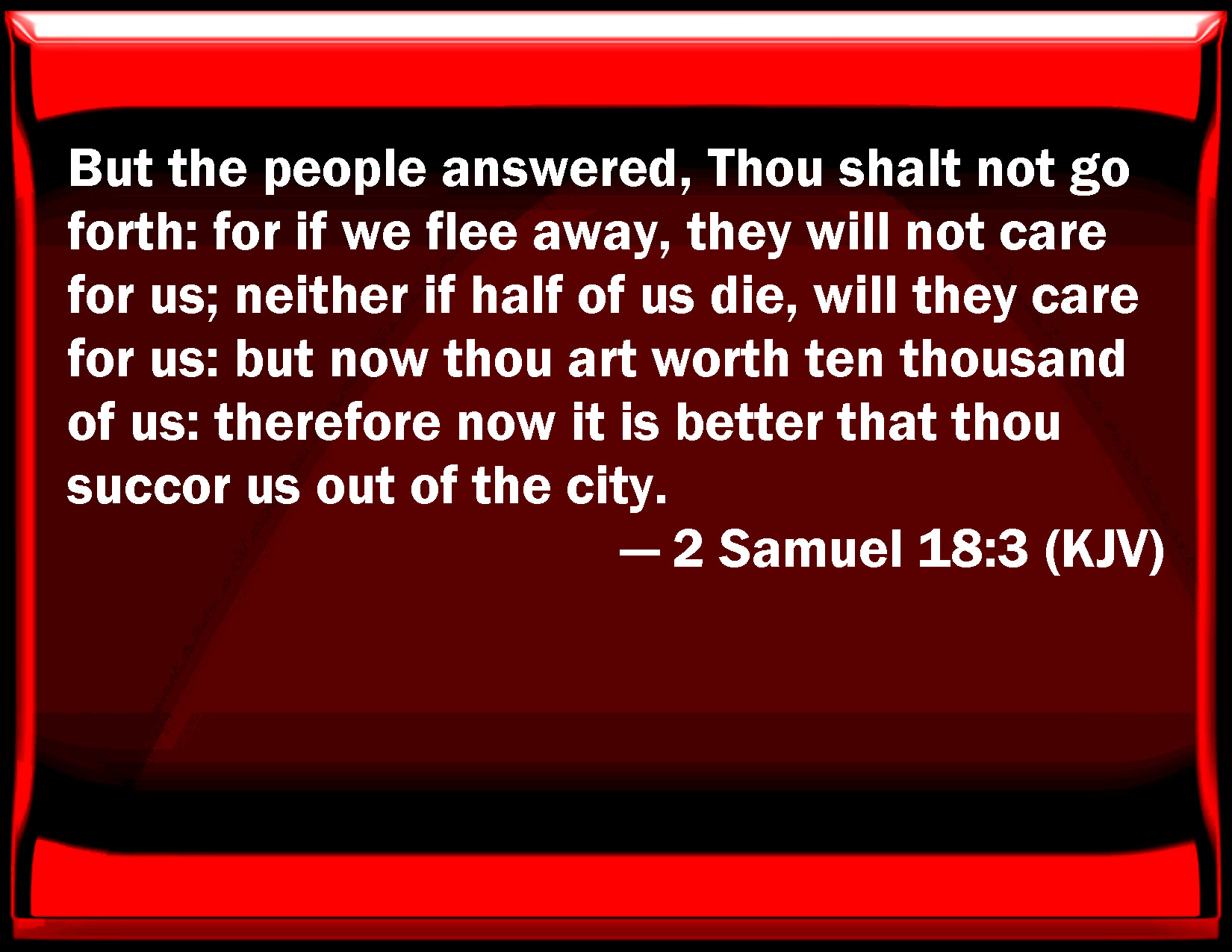 Bible Verse Slide 2 Samuel 18:3 But the people answered, You shall not go forth: for if we flee away, they will not care for us; neither if half of us die, will they care for us: but now you are worth ten thousand of us: therefore now it is better that you succor us out of the city. KJV: But the people answered, Thou shalt not go forth: for if we flee away, they will not care for us; neither if half of us die, will they care for us: but now thou art worth ten thousand of us: therefore now it is better that thou succour us out of the city. DRB: And the people answered: Thou shalt not go forth: for if we flee away, they will not much mind us: or if half of us should fall, they will not greatly care: for thou alone art accounted for ten thousand: it is better therefore that thou shouldst be in the city to succour us. DBT: But the people said, Thou shalt not go forth, for if we should in any case flee, they will not care for us; neither if half of us die, will they care for us; for thou art worth ten thousand of us; and now it is better that thou succour us out of the city. ERV: But the people said, Thou shalt not go forth: for if we flee away, they will not care for us; neither if half of us die, will they care for us: but thou art worth ten thousand of us: therefore now it is better that thou be ready to succour us out of the city. WBT: But the people answered, Thou shalt not go forth: for if we flee away, they will not care for us; neither if half of us die, will they care for us: but now thou art worth ten thousand of us: therefore now it is better that thou shouldst succor us out of the city. WEB: But the people said, "You shall not go forth; for if we flee away, they will not care for us; neither if half of us die, will they care for us. But you are worth ten thousand of us. Therefore now it is better that you are ready to help us out of the city." YLT: And the people say, 'Thou dost not go out, for if we utterly flee, they do not set their heart upon us; and if half of us die, they do not set their heart unto us — for now like us are ten thousand; and now, better that thou be to us from the city for an helper.'Links 2 Samuel 18:3 NIV • 2 Samuel 18:3 NLT • 2 Samuel 18:3 ESV • 2 Samuel 18:3 NASB • 2 Samuel 18:3 KJV • 2 Samuel 18:3 Interlinear • 2 Samuel 18:3 Commentaries • 2 Samuel 18:3 Parallel Texts • 2 Samuel 18:3 Bible Apps • 2 Samuel 18:3 Parallel • Bible Hub |