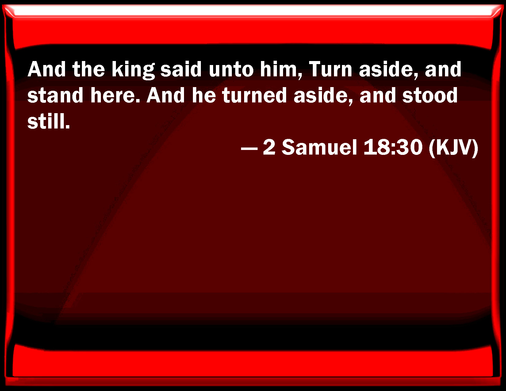 Bible Verse Slide 2 Samuel 18:30 And the king said to him, Turn aside, and stand here. And he turned aside, and stood still. KJV: And the king said unto him, Turn aside, and stand here. And he turned aside, and stood still. DRB: And the king said to him: Pass, and stand here. DBT: And the king said, Turn aside and stand here. And he turned aside and stood still. ERV: And the king said, Turn aside, and stand here. And he turned aside, and stood still. WBT: And the king said to him, Turn aside, and stand here. And he turned aside, and stood still. WEB: The king said, "Turn aside, and stand here." He turned aside, and stood still. YLT: And the king saith, 'Turn round, station thyself here;' and he turneth round and standeth still.Links 2 Samuel 18:30 NIV • 2 Samuel 18:30 NLT • 2 Samuel 18:30 ESV • 2 Samuel 18:30 NASB • 2 Samuel 18:30 KJV • 2 Samuel 18:30 Interlinear • 2 Samuel 18:30 Commentaries • 2 Samuel 18:30 Parallel Texts • 2 Samuel 18:30 Bible Apps • 2 Samuel 18:30 Parallel • Bible Hub |