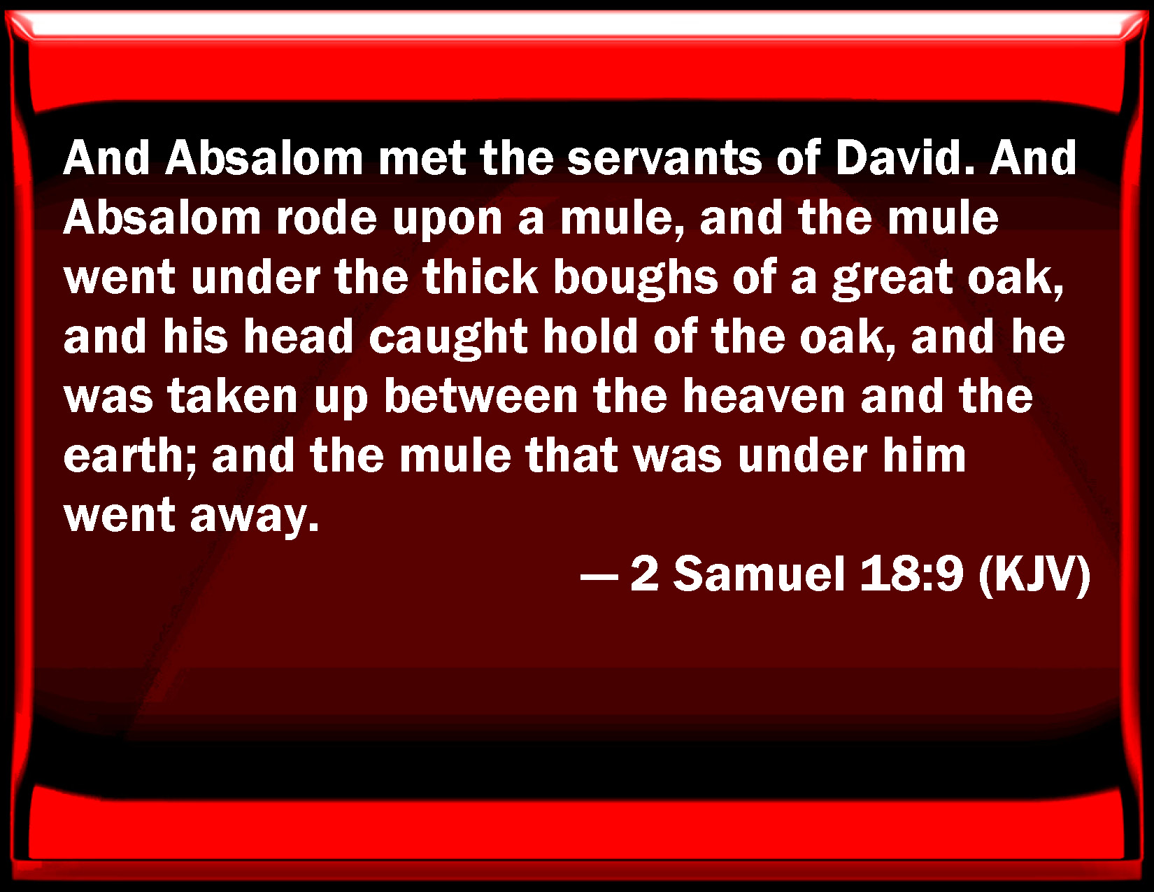 Bible Verse Slide 2 Samuel 18:9 And Absalom met the servants of David. And Absalom rode on a mule, and the mule went under the thick boughs of a great oak, and his head caught hold of the oak, and he was taken up between the heaven and the earth; and the mule that was under him went away. KJV: And Absalom met the servants of David. And Absalom rode upon a mule, and the mule went under the thick boughs of a great oak, and his head caught hold of the oak, and he was taken up between the heaven and the earth; and the mule that was under him went away. DRB: And it happened that Absalom met he servants of David, riding on a mule: and as the mule went under a thick and large oak, his head stuck in the oak: and while he hung between the heaven and he earth, the mule on which he rode passed on. DBT: And Absalom found himself in the presence of David's servants. And Absalom was riding upon a mule, and the mule went under the thick boughs of the great terebinth, and his head caught in the terebinth, and he was taken up between the heaven and the earth; and the mule that was under him went away. ERV: And Absalom chanced to meet the servants of David. And Absalom rode upon his mule, and the mule went under the thick boughs of a great oak, and his head caught hold of the oak, and he was taken up between the heaven and the earth; and the mule that was under him went on. WBT: And Absalom met the servants of David. And Absalom rode upon a mule, and the mule went under the thick boughs of a great oak, and his head caught hold of the oak, and he was suspended between the heaven and the earth; and the mule that was under him went away. WEB: Absalom happened to meet the servants of David. Absalom was riding on his mule, and the mule went under the thick boughs of a great oak, and his head caught hold of the oak, and he was taken up between the sky and earth; and the mule that was under him went on. YLT: And Absalom meeteth before the servants of David, and Absalom is riding on the mule, and the mule cometh in under an entangled bough of the great oak, and his head taketh hold on the oak, and he is placed between the heavens and the earth, and the mule that is under him hath passed on.Links 2 Samuel 18:9 NIV • 2 Samuel 18:9 NLT • 2 Samuel 18:9 ESV • 2 Samuel 18:9 NASB • 2 Samuel 18:9 KJV • 2 Samuel 18:9 Interlinear • 2 Samuel 18:9 Commentaries • 2 Samuel 18:9 Parallel Texts • 2 Samuel 18:9 Bible Apps • 2 Samuel 18:9 Parallel • Bible Hub |