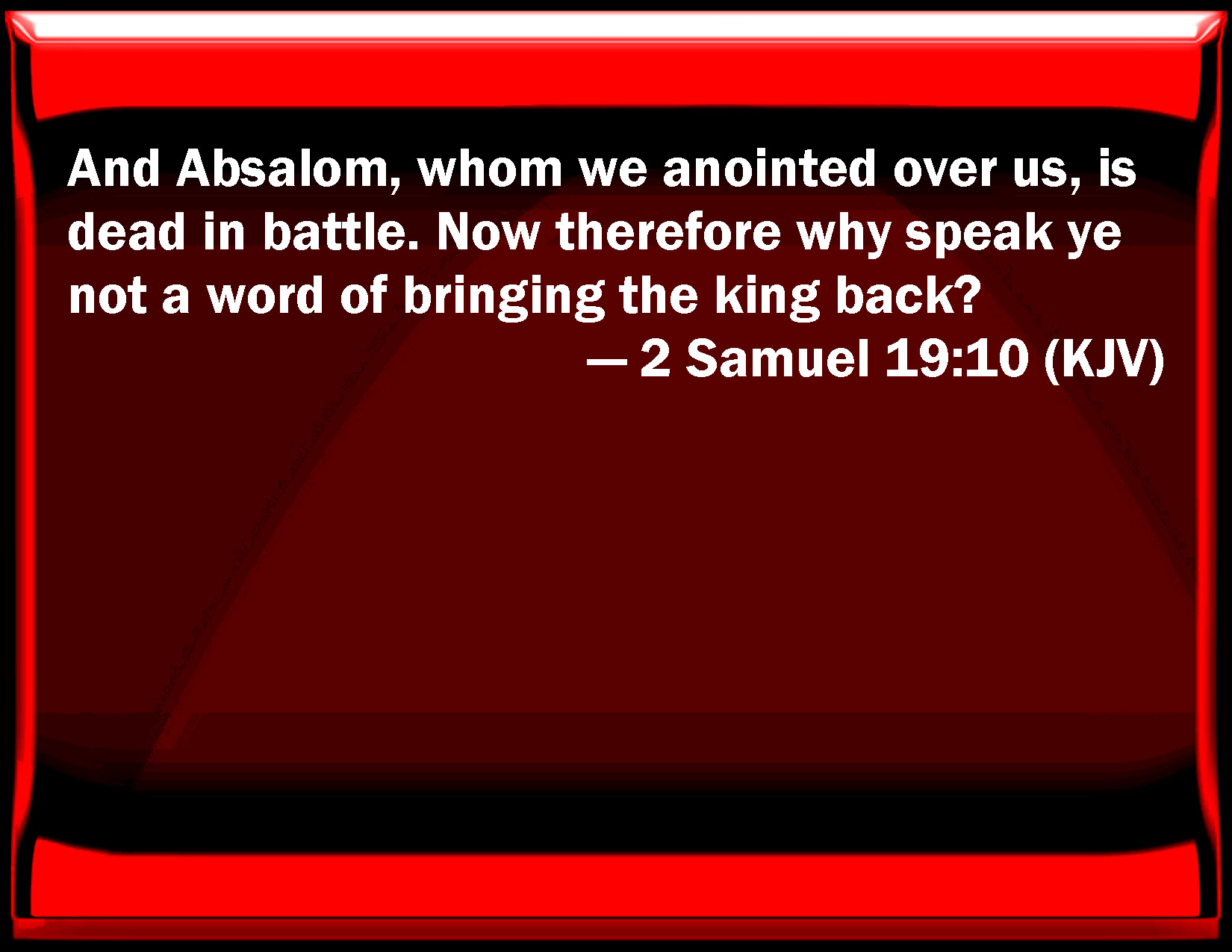 Bible Verse Slide 2 Samuel 19:10 And Absalom, whom we anointed over us, is dead in battle. Now therefore why speak you not a word of bringing the king back? KJV: And Absalom, whom we anointed over us, is dead in battle. Now therefore why speak ye not a word of bringing the king back? DRB: But Absalom, whom we anointed over us, is dead in the battle: how long are you silent, and bring not back the king? DBT: And Absalom, whom we anointed over us, is dead in battle; and now why are ye silent as to bringing the king back? ERV: And Absalom, whom we anointed over us, is dead in battle. Now therefore why speak ye not a word of bringing the king back? WBT: And Absalom, whom we anointed over us, is dead in battle. Now therefore why speak ye not a word of bringing the king back? WEB: Absalom, whom we anointed over us, is dead in battle. Now therefore why don't you speak a word of bringing the king back?" YLT: and Absalom whom we anointed over us is dead in battle, and now, why are ye silent — to bring back the king?'Links 2 Samuel 19:10 NIV • 2 Samuel 19:10 NLT • 2 Samuel 19:10 ESV • 2 Samuel 19:10 NASB • 2 Samuel 19:10 KJV • 2 Samuel 19:10 Interlinear • 2 Samuel 19:10 Commentaries • 2 Samuel 19:10 Parallel Texts • 2 Samuel 19:10 Bible Apps • 2 Samuel 19:10 Parallel • Bible Hub |
