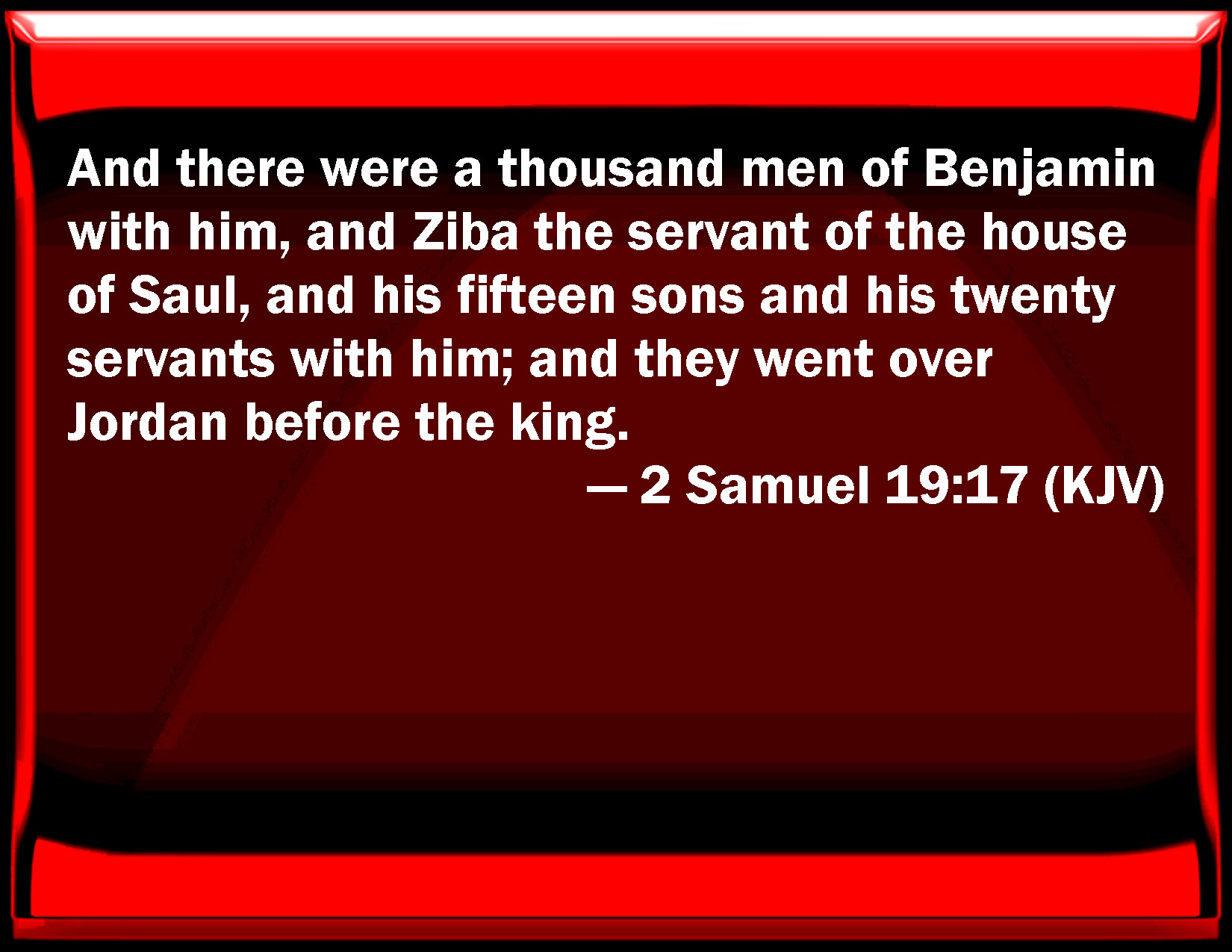 Bible Verse Slide 2 Samuel 19:17 And there were a thousand men of Benjamin with him, and Ziba the servant of the house of Saul, and his fifteen sons and his twenty servants with him; and they went over Jordan before the king. KJV: And there were a thousand men of Benjamin with him, and Ziba the servant of the house of Saul, and his fifteen sons and his twenty servants with him; and they went over Jordan before the king. DRB: With a thousand men of Benjamin, and Siba the servant of the house of Saul: and his fifteen sons, and twenty servants were with him: and going over the Jordan, DBT: And there were a thousand men of Benjamin with him, and Ziba the servant of the house of Saul, and his fifteen sons and his twenty servants with him; and they forded the Jordan before the king. ERV: And there were a thousand men of Benjamin with him, and Ziba the servant of the house of Saul, and his fifteen sons and his twenty servants with him; and they went through Jordan in the presence of the king. WBT: And there were a thousand men of Benjamin with him, and Ziba the servant of the house of Saul, and his fifteen sons and his twenty servants with him; and they went over Jordan before the king. WEB: There were a thousand men of Benjamin with him, and Ziba the servant of the house of Saul, and his fifteen sons and his twenty servants with him; and they went through the Jordan in the presence of the king. YLT: and a thousand men are with him from Benjamin, and Ziba servant of the house of Saul, and his fifteen sons and his twenty servants with him, and they have gone prosperously over the Jordan before the king.Links 2 Samuel 19:17 NIV • 2 Samuel 19:17 NLT • 2 Samuel 19:17 ESV • 2 Samuel 19:17 NASB • 2 Samuel 19:17 KJV • 2 Samuel 19:17 Interlinear • 2 Samuel 19:17 Commentaries • 2 Samuel 19:17 Parallel Texts • 2 Samuel 19:17 Bible Apps • 2 Samuel 19:17 Parallel • Bible Hub |