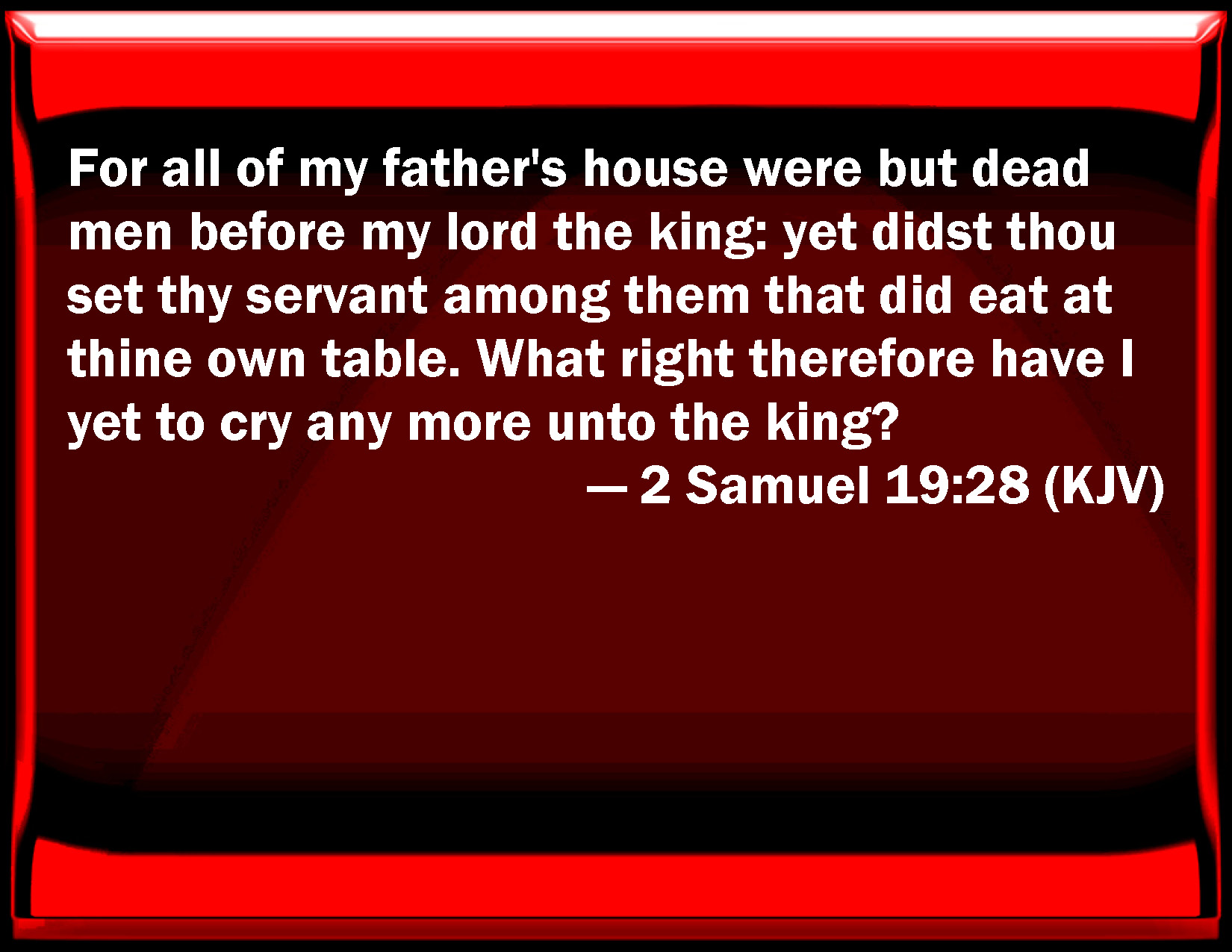 2 Samuel 19:28 For all of my father's house were but dead men before my lord the king: yet did you set your servant among them that did eat at your own table. What right therefore have I yet to cry any more to the king?