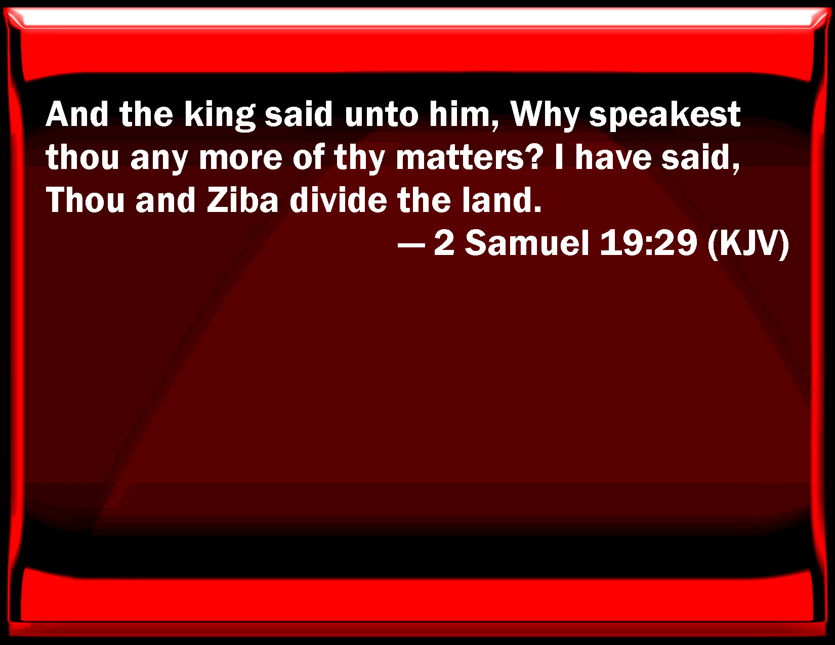 Bible Verse Slide 2 Samuel 19:29 And the king said to him, Why speak you any more of your matters? I have said, You and Ziba divide the land. KJV: And the king said unto him, Why speakest thou any more of thy matters? I have said, Thou and Ziba divide the land. DRB: Then the king said to him: Why speakest thou any more? what I have said is determined: thou and Siba divide the possessions. DBT: And the king said to him, Why speakest thou any more of thy matters? I have said, Thou and Ziba divide the land. ERV: And the king said unto him, Why speakest thou any more of thy matters? I say, Thou and Ziba divide the land. WBT: And the king said to him, Why speakest thou any more of thy matters? I have said, Thou and Ziba divide the land. WEB: The king said to him, "Why do you speak any more of your matters? I say, you and Ziba divide the land." YLT: And the king saith to him, 'Why dost thou speak any more of thy matters? I have said, Thou and Ziba — share ye the field.'Links 2 Samuel 19:29 NIV • 2 Samuel 19:29 NLT • 2 Samuel 19:29 ESV • 2 Samuel 19:29 NASB • 2 Samuel 19:29 KJV • 2 Samuel 19:29 Interlinear • 2 Samuel 19:29 Commentaries • 2 Samuel 19:29 Parallel Texts • 2 Samuel 19:29 Bible Apps • 2 Samuel 19:29 Parallel • Bible Hub |