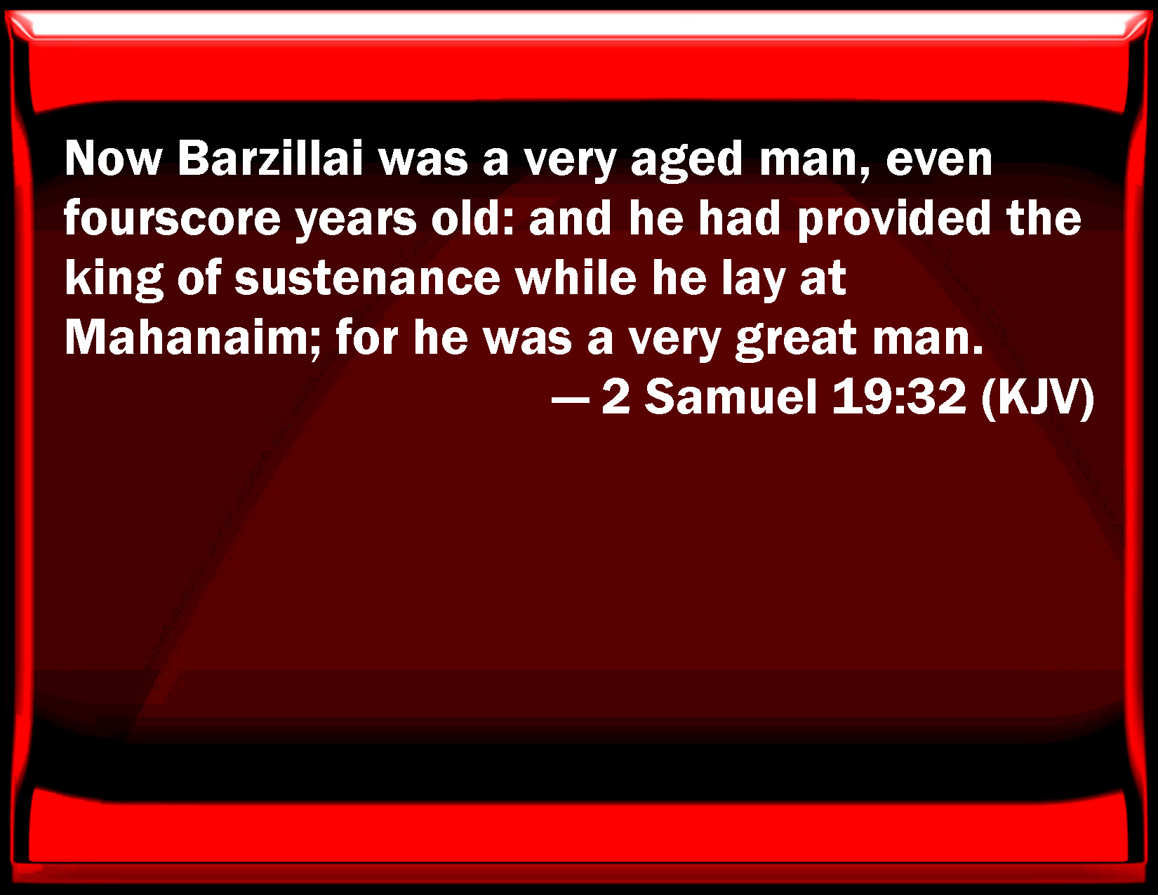 Bible Verse Slide 2 Samuel 19:32 Now Barzillai was a very aged man, even fourscore years old: and he had provided the king of sustenance while he lay at Mahanaim; for he was a very great man. KJV: Now Barzillai was a very aged man, even fourscore years old: and he had provided the king of sustenance while he lay at Mahanaim; for he was a very great man. DRB: Now Berzellai the Galaadite was of a great age, that is to say, fourscore years old, and he provided the king with sustenance when he abode in the camp: for he was a man exceeding rich. DBT: And Barzillai was very aged, eighty years old; and it was he that had maintained the king while he abode at Mahanaim; for he was a very great man. ERV: Now Barzillai was a very aged man, even fourscore years old: and he had provided the king with sustenance while he lay at Mahanaim; for he was a very great man. WBT: Now Barzillai was a very aged man, even eighty years old: and he had provided the king with sustenance while he lay at Mahanaim: for he was a very great man. WEB: Now Barzillai was a very aged man, even eighty years old: and he had provided the king with sustenance while he lay at Mahanaim; for he was a very great man. YLT: and Barzillai is very aged, a son of eighty years, and he hath sustained the king in his abiding in Mahanaim, for he is a very great man;Links 2 Samuel 19:32 NIV • 2 Samuel 19:32 NLT • 2 Samuel 19:32 ESV • 2 Samuel 19:32 NASB • 2 Samuel 19:32 KJV • 2 Samuel 19:32 Interlinear • 2 Samuel 19:32 Commentaries • 2 Samuel 19:32 Parallel Texts • 2 Samuel 19:32 Bible Apps • 2 Samuel 19:32 Parallel • Bible Hub |
