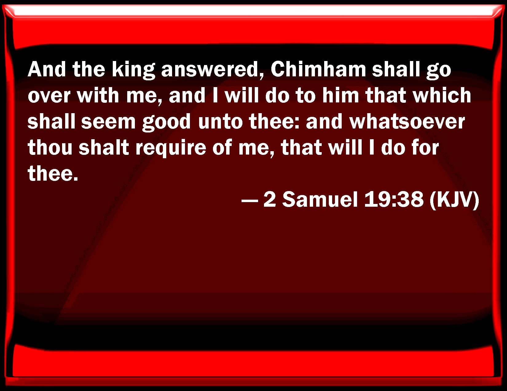 Bible Verse Slide 2 Samuel 19:38 And the king answered, Chimham shall go over with me, and I will do to him that which shall seem good to you: and whatever you shall require of me, that will I do for you. KJV: And the king answered, Chimham shall go over with me, and I will do to him that which shall seem good unto thee: and whatsoever thou shalt require of me, that will I do for thee. DRB: Then the king said to him: Let Chamaam go over with me, and I will do for him whatsoever shall please thee, and all that thou shalt ask of me, thou shalt obtain. DBT: And the king said, Chimham shall go over with me, and I will do to him that which seems good to thee; and whatsoever thou shalt require of me, that will I do for thee. ERV: And the king answered, Chimham shall go over with me, and I will do to him that which shall seem good unto thee: and whatsoever thou shalt require of me, that will I do for thee. WBT: And the king answered, Chimham shall go over with me, and I will do to him that which shall seem good to thee: and whatever thou shalt require of me, that will I do for thee. WEB: The king answered, "Chimham shall go over with me, and I will do to him that which shall seem good to you. Whatever you require of me, that I will do for you." YLT: And the king saith, 'With me doth Chimham go over, and I do to him that which is good in thine eyes, yea, all that thou dost fix on me I do to thee.'Links 2 Samuel 19:38 NIV • 2 Samuel 19:38 NLT • 2 Samuel 19:38 ESV • 2 Samuel 19:38 NASB • 2 Samuel 19:38 KJV • 2 Samuel 19:38 Interlinear • 2 Samuel 19:38 Commentaries • 2 Samuel 19:38 Parallel Texts • 2 Samuel 19:38 Bible Apps • 2 Samuel 19:38 Parallel • Bible Hub |