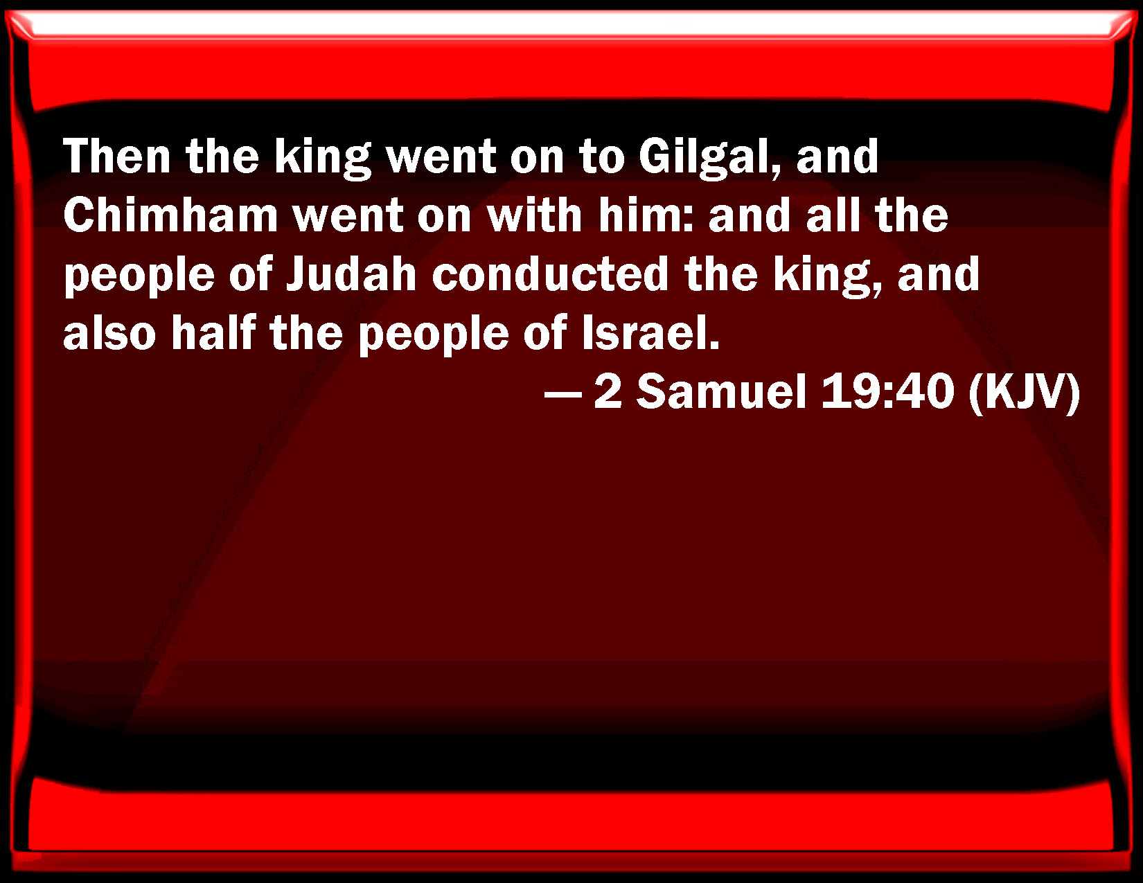 Bible Verse Slide 2 Samuel 19:40 Then the king went on to Gilgal, and Chimham went on with him: and all the people of Judah conducted the king, and also half the people of Israel. KJV: Then the king went on to Gilgal, and Chimham went on with him: and all the people of Judah conducted the king, and also half the people of Israel. DRB: So the king went on to Galgal, and Chamaam with him. Now all the people of Juda had brought the king over, and only half of the people of Israel were there. DBT: And the king went on to Gilgal, and Chimham went on with him; and all the people of Judah conducted the king, and also half the people of Israel. ERV: So the king went over to Gilgal, and Chimham went over with him: and all the people of Judah brought the king over, and also half the people of Israel. WBT: Then the king went on to Gilgal, and Chimham went on with him: and all the people of Judah conducted the king, and also half the people of Israel. WEB: So the king went over to Gilgal, and Chimham went over with him. All the people of Judah brought the king over, and also half the people of Israel. YLT: And the king passeth over to Gilgal, and Chimham hath passed over with him, and all the people of Judah, and they bring over the king, and also the half of the people of Israel.Links 2 Samuel 19:40 NIV • 2 Samuel 19:40 NLT • 2 Samuel 19:40 ESV • 2 Samuel 19:40 NASB • 2 Samuel 19:40 KJV • 2 Samuel 19:40 Interlinear • 2 Samuel 19:40 Commentaries • 2 Samuel 19:40 Parallel Texts • 2 Samuel 19:40 Bible Apps • 2 Samuel 19:40 Parallel • Bible Hub |