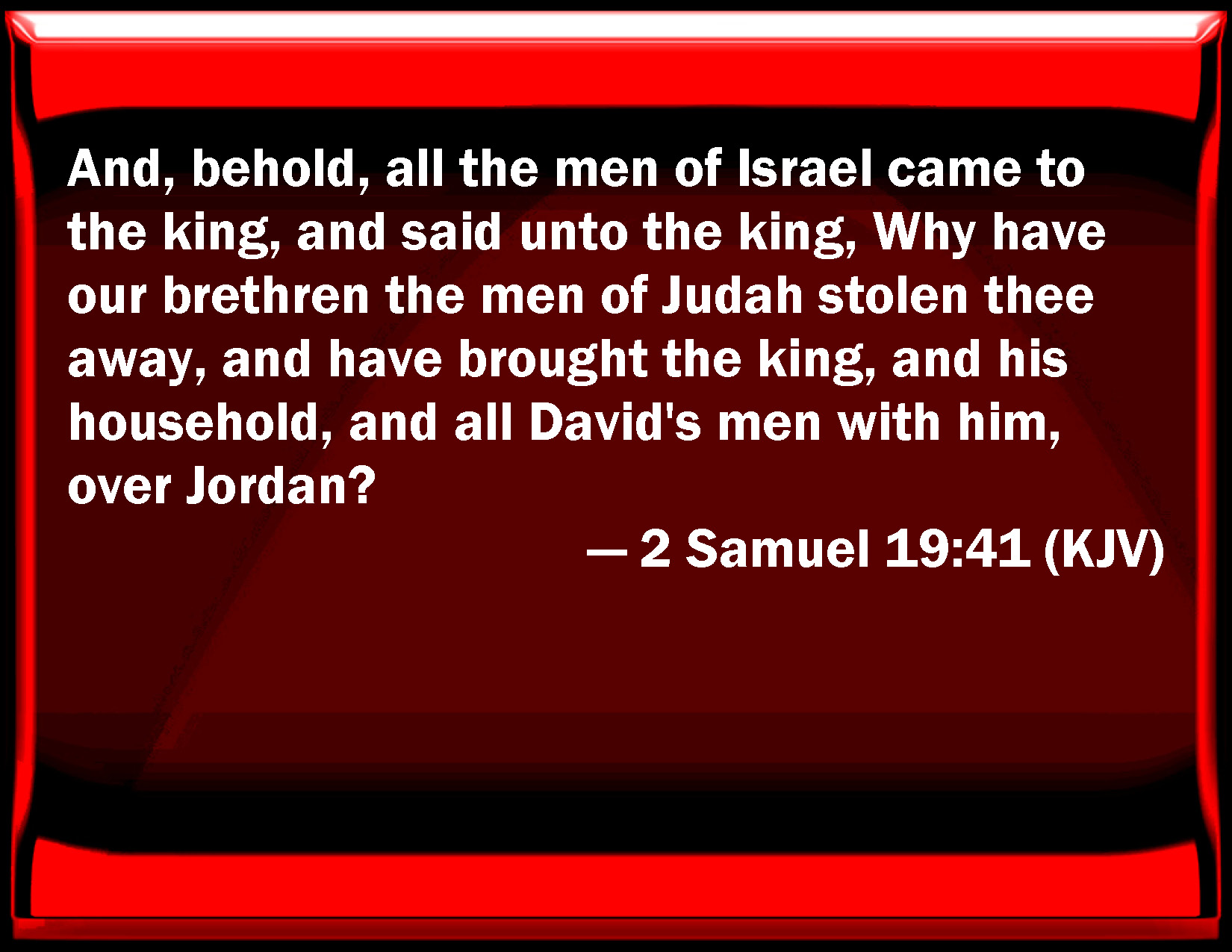 Bible Verse Slide 2 Samuel 19:41 And, behold, all the men of Israel came to the king, and said to the king, Why have our brothers the men of Judah stolen you away, and have brought the king, and his household, and all David's men with him, over Jordan? KJV: And, behold, all the men of Israel came to the king, and said unto the king, Why have our brethren the men of Judah stolen thee away, and have brought the king, and his household, and all David's men with him, over Jordan? DRB: Therefore all the men of Israel running together to the king, said to him: Why have our brethren the men of Juda stolen thee away, and have brought the king and his household over the Jordan, and all the men of David with him? DBT: And behold, all the men of Israel came to the king, and said to the king, Why have our brethren the men of Judah stolen thee away, and have brought the king, and his household, and all David's men with him, over the Jordan? ERV: And, behold, all the men of Israel came to the king; and said unto the king, Why have our brethren the men of Judah stolen thee away, and brought the king, and his household, over Jordan, and all David's men with him? WBT: And behold, all the men of Israel came to the king, and said to him, Why have our brethren the men of Judah stolen thee away, and have brought the king, and his household, and all David's men with him, over Jordan? WEB: Behold, all the men of Israel came to the king, and said to the king, "Why have our brothers the men of Judah stolen you away, and brought the king, and his household, over the Jordan, and all David's men with him?" YLT: And, lo, all the men of Israel are coming unto the king, and they say unto the king, 'Wherefore have they stolen thee — our brethren, the men of Judah?' (and they bring the king and his household over the Jordan, and all the men of David with him).Links 2 Samuel 19:41 NIV • 2 Samuel 19:41 NLT • 2 Samuel 19:41 ESV • 2 Samuel 19:41 NASB • 2 Samuel 19:41 KJV • 2 Samuel 19:41 Interlinear • 2 Samuel 19:41 Commentaries • 2 Samuel 19:41 Parallel Texts • 2 Samuel 19:41 Bible Apps • 2 Samuel 19:41 Parallel • Bible Hub |