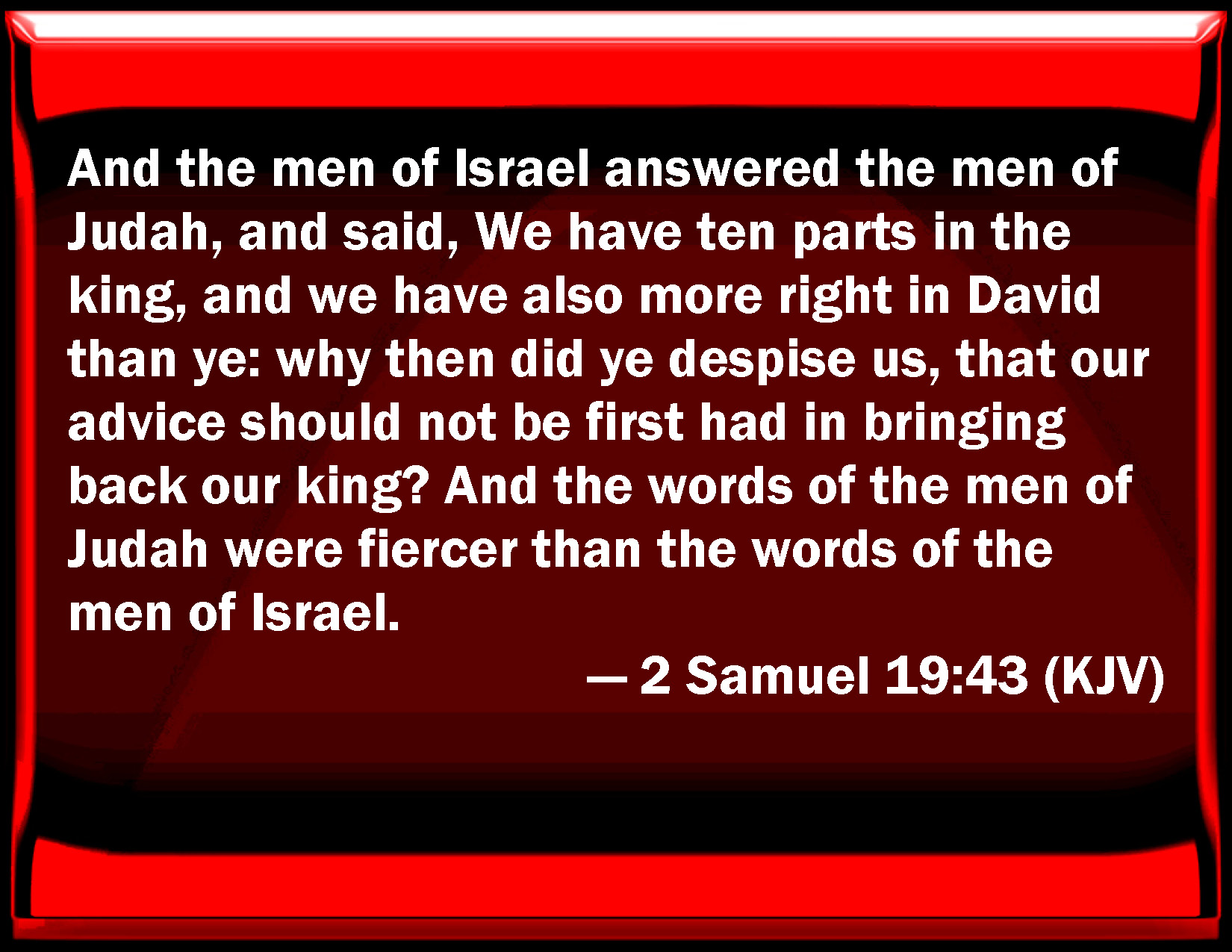 2 Samuel 19:43 And the men of Israel answered the men of Judah, and said, We have ten parts in the king, and we have also more right in David than you: why then did you despise us, that our advice should not be first had in bringing back our king? And the words of the men of Judah were fiercer than the words of the men of Israel.