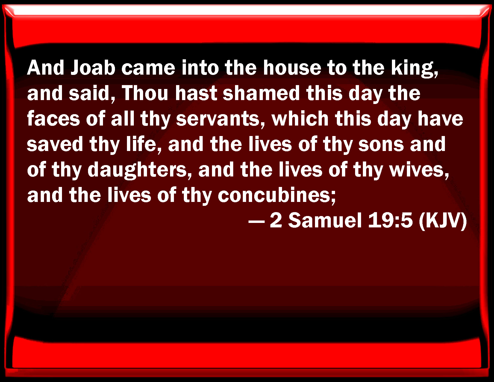 Bible Verse Slide 2 Samuel 19:5 And Joab came into the house to the king, and said, You have shamed this day the faces of all your servants, which this day have saved your life, and the lives of your sons and of your daughters, and the lives of your wives, and the lives of your concubines; KJV: And Joab came into the house to the king, and said, Thou hast shamed this day the faces of all thy servants, which this day have saved thy life, and the lives of thy sons and of thy daughters, and the lives of thy wives, and the lives of thy concubines; DRB: Then Joab going into the house to the king, said: Thou hast shamed this day the faces of all thy servants, that have saved thy life, and the lives of thy sons, and of thy daughters, and the lives of thy wives, and the lives of thy concubines. DBT: And Joab came into the house to the king, and said, Thou hast put to shame this day the faces of all thy servants who have this day saved thy life, and the lives of thy sons and of thy daughters, and the lives of thy wives and the lives of thy concubines; ERV: And Joab came into the house to the king, and said, Thou hast shamed this day the faces of all thy servants, which this day have saved thy life, and the lives of thy sons and of thy daughters, and the lives of thy wives, and the lives of thy concubines; WBT: And Joab came into the house to the king, and said, thou hast shamed this day the faces of all thy servants, who this day have saved thy life, and the lives of thy sons and of thy daughters, and the lives of thy wives, and the lives of thy concubines; WEB: Joab came into the house to the king, and said, "You have shamed this day the faces of all your servants, who this day have saved your life, and the lives of your sons and of your daughters, and the lives of your wives, and the lives of your concubines; YLT: And Joab cometh in unto the king to the house, and saith, 'Thou hast put to shame to-day the faces of all thy servants, those delivering thy life to-day, and the life of thy sons, and of thy daughters, and the life of thy wives, and the life of thy concubines,Links 2 Samuel 19:5 NIV • 2 Samuel 19:5 NLT • 2 Samuel 19:5 ESV • 2 Samuel 19:5 NASB • 2 Samuel 19:5 KJV • 2 Samuel 19:5 Interlinear • 2 Samuel 19:5 Commentaries • 2 Samuel 19:5 Parallel Texts • 2 Samuel 19:5 Bible Apps • 2 Samuel 19:5 Parallel • Bible Hub |