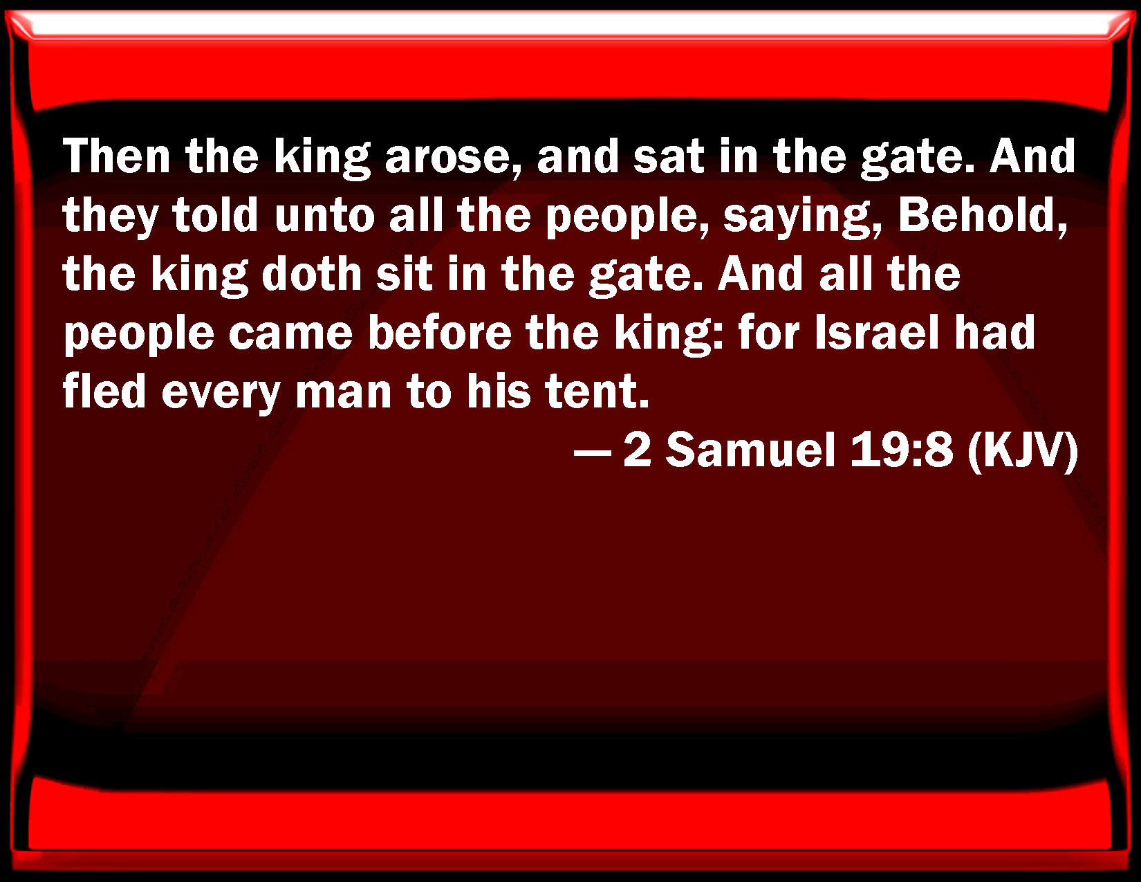 Bible Verse Slide 2 Samuel 19:8 Then the king arose, and sat in the gate. And they told to all the people, saying, Behold, the king does sit in the gate. And all the people came before the king: for Israel had fled every man to his tent. KJV: Then the king arose, and sat in the gate. And they told unto all the people, saying, Behold, the king doth sit in the gate. And all the people came before the king: for Israel had fled every man to his tent. DRB: Then the king arose and sat in the gate: and it was told to all the people that the king sat in the gate: and all the people came before the king, but Israel fled to their own dwellings. DBT: Then the king arose, and sat in the gate. And they told all the people, saying, Behold, the king is sitting in the gate. And all the people came before the king. Now Israel had fled every man to his tent. ERV: Then the king arose, and sat in the gate. And they told unto all the people, saying, Behold, the king doth sit in the gate: and all the people came before the king. Now Israel had fled every man to his tent. WBT: Then the king rose, and sat in the gate. And they told to all the people, saying, Behold, the king doth sit in the gate. And all the people came before the king: for Israel had fled every man to his tent. WEB: Then the king arose, and sat in the gate. They told to all the people, saying, "Behold, the king is sitting in the gate." All the people came before the king. Now Israel had fled every man to his tent. YLT: And the king riseth, and sitteth in the gate, and to all the people they have declared, saying, 'Lo, the king is sitting in the gate;' and all the people come in before the king, and Israel hath fled, each to his tents.Links 2 Samuel 19:8 NIV • 2 Samuel 19:8 NLT • 2 Samuel 19:8 ESV • 2 Samuel 19:8 NASB • 2 Samuel 19:8 KJV • 2 Samuel 19:8 Interlinear • 2 Samuel 19:8 Commentaries • 2 Samuel 19:8 Parallel Texts • 2 Samuel 19:8 Bible Apps • 2 Samuel 19:8 Parallel • Bible Hub |