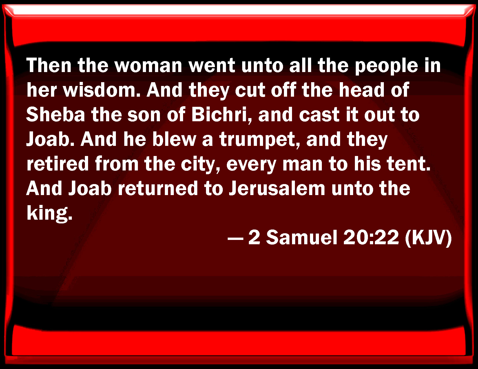 Bible Verse Slide 2 Samuel 20:22 Then the woman went to all the people in her wisdom. And they cut off the head of Sheba the son of Bichri, and cast it out to Joab. And he blew a trumpet, and they retired from the city, every man to his tent. And Joab returned to Jerusalem to the king. KJV: Then the woman went unto all the people in her wisdom. And they cut off the head of Sheba the son of Bichri, and cast it out to Joab. And he blew a trumpet, and they retired from the city, every man to his tent. And Joab returned to Jerusalem unto the king. DRB: So she went to all the people, and spoke to them wisely: and they cut off the head of Seba the son of Bochri, and cast it out to Joab. And he sounded the trumpet, and they departed from the city, every one to their home: and Joab returned to Jerusalem to the king. DBT: Then the woman went to all the people in her wisdom. And they cut off the head of Sheba the son of Bichri, and cast it to Joab. And he blew a trumpet, and they dispersed from the city, every man to his tent. And Joab returned to Jerusalem to the king. ERV: Then the woman went unto all the people in her wisdom. And they cut off the head of Sheba the son of Bichri, and threw it out to Joab. And he blew the trumpet, and they were dispersed from the city, every man to his tent. And Joab returned to Jerusalem unto the king. WBT: Then the woman went to all the people in her wisdom. And they cut off the head of Sheba the son of Bichri, and cast it out to Joab. And he blew a trumpet, and they retired from the city, every man to his tent. And Joab returned to Jerusalem to the king. WEB: Then the woman went to all the people in her wisdom. They cut off the head of Sheba the son of Bichri, and threw it out to Joab. He blew the trumpet, and they were dispersed from the city, every man to his tent. Joab returned to Jerusalem to the king. YLT: And the woman cometh unto all the people in her wisdom, and they cut off the head of Sheba son of Bichri, and cast it unto Joab, and he bloweth with a trumpet, and they are scattered from the city, each to his tents, and Joab hath turned back to Jerusalem unto the king.Links 2 Samuel 20:22 NIV • 2 Samuel 20:22 NLT • 2 Samuel 20:22 ESV • 2 Samuel 20:22 NASB • 2 Samuel 20:22 KJV • 2 Samuel 20:22 Interlinear • 2 Samuel 20:22 Commentaries • 2 Samuel 20:22 Parallel Texts • 2 Samuel 20:22 Bible Apps • 2 Samuel 20:22 Parallel • Bible Hub |