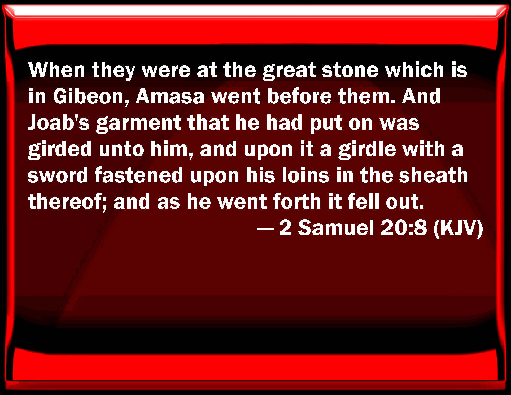 Bible Verse Slide 2 Samuel 20:8 When they were at the great stone which is in Gibeon, Amasa went before them. And Joab's garment that he had put on was girded to him, and on it a girdle with a sword fastened on his loins in the sheath thereof; and as he went forth it fell out. KJV: When they were at the great stone which is in Gibeon, Amasa went before them. And Joab's garment that he had put on was girded unto him, and upon it a girdle with a sword fastened upon his loins in the sheath thereof; and as he went forth it fell out. DRB: And when they were at the great stone which is in Gabaon, Amasa coming met them. And Joab had on a close coat of equal length with his habit, and over it was girded with a sword hanging down to his flank, in a scabbard, made in such manner as to come out with the least motion and strike. DBT: When they were at the great stone which is in Gibeon, Amasa came before them. And Joab was girded with his coat, his dress, and upon it was the girdle of the sword which was fastened on his loins in its sheath; and as he went forth it fell out. ERV: When they were at the great stone which is in Gibeon, Amasa came to meet them. And Joab was girded with his apparel of war that he had put on, and thereon was a girdle with a sword fastened upon his loins in the sheath thereof; and as he went forth it fell out. WBT: When they were at the great stone which is in Gibeon, Amasa went before them. And Joab's garment that he had put on was girded to him, and upon it a girdle with a sword fastened upon his loins in its sheath; and as he went forth it fell out. WEB: When they were at the great stone which is in Gibeon, Amasa came to meet them. Joab was clothed in his apparel of war that he had put on, and on it was a sash with a sword fastened on his waist in its sheath; and as he went forth it fell out. YLT: they are near the great stone that is in Gibeon, and Amasa hath gone before them, and Joab is girded; his long robe he hath put on him, and upon it a girdle — a sword is fastened upon his loins in its sheath; and he hath gone out, and it falleth.Links 2 Samuel 20:8 NIV • 2 Samuel 20:8 NLT • 2 Samuel 20:8 ESV • 2 Samuel 20:8 NASB • 2 Samuel 20:8 KJV • 2 Samuel 20:8 Interlinear • 2 Samuel 20:8 Commentaries • 2 Samuel 20:8 Parallel Texts • 2 Samuel 20:8 Bible Apps • 2 Samuel 20:8 Parallel • Bible Hub |