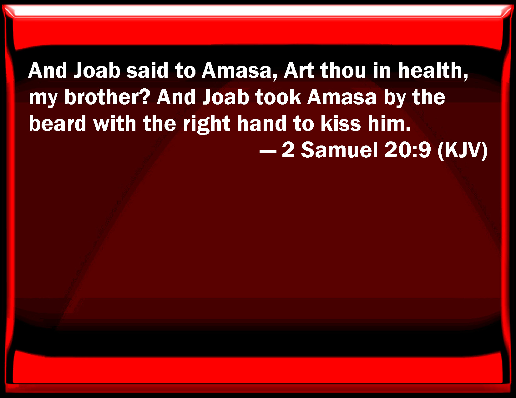 Bible Verse Slide 2 Samuel 20:9 And Joab said to Amasa, Are you in health, my brother? And Joab took Amasa by the beard with the right hand to kiss him. KJV: And Joab said to Amasa, Art thou in health, my brother? And Joab took Amasa by the beard with the right hand to kiss him. DRB: And Joab said to Amasa: God save thee, my brother. And he took Amasa by the chin with his right hand to kiss him. DBT: And Joab said to Amasa, Art thou well, my brother? And Joab took Amasa by the beard with the right hand to kiss him. ERV: And Joab said to Amasa, Is it well with thee, my brother? And Joab took Amasa by the beard with his right hand to kiss him. WBT: And Joab said to Amasa, Art thou in health, my brother? And Joab took Amasa by the beard with the right hand to kiss him. WEB: Joab said to Amasa, "Is it well with you, my brother?" Joab took Amasa by the beard with his right hand to kiss him. YLT: And Joab saith to Amasa, 'Art thou in peace, my brother?' and the right hand of Joab layeth hold on the beard of Amasa to give a kiss to him;Links 2 Samuel 20:9 NIV • 2 Samuel 20:9 NLT • 2 Samuel 20:9 ESV • 2 Samuel 20:9 NASB • 2 Samuel 20:9 KJV • 2 Samuel 20:9 Interlinear • 2 Samuel 20:9 Commentaries • 2 Samuel 20:9 Parallel Texts • 2 Samuel 20:9 Bible Apps • 2 Samuel 20:9 Parallel • Bible Hub |