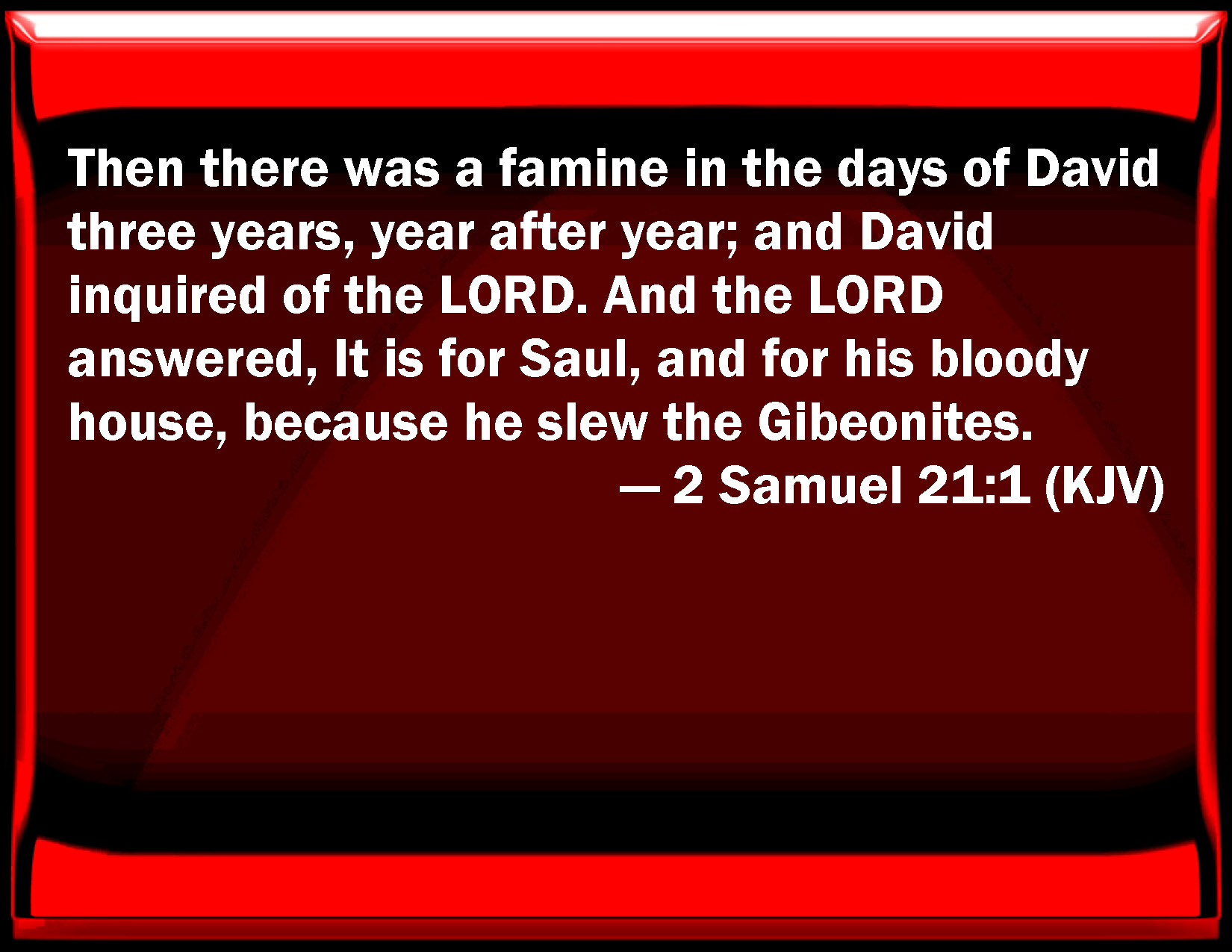 Bible Verse Slide 2 Samuel 21:1 Then there was a famine in the days of David three years, year after year; and David inquired of the LORD. And the LORD answered, It is for Saul, and for his bloody house, because he slew the Gibeonites. KJV: Then there was a famine in the days of David three years, year after year; and David inquired of the LORD. And the LORD answered, It is for Saul, and for his bloody house, because he slew the Gibeonites. DRB: And there was a famine in the days of David for three years successively: and David consulted the oracle of the Lord. And the Lord said: It is for Saul, and his bloody house, because he slew the Gabaonites. DBT: And there was a famine in the days of David three years, year after year; and David inquired of Jehovah. And Jehovah said, It is for Saul, and for his house of blood, because he slew the Gibeonites. ERV: And there was a famine in the days of David three years, year after year; and David sought the face of the LORD. And the LORD said, It is for Saul, and for his bloody house, because he put to death the Gibeonites. WBT: Then there was a famine in the days of David three years, year after year; and David inquired of the LORD. And the LORD answered, It is for Saul, and for his bloody house, because he slew the Gibeonites. WEB: There was a famine in the days of David three years, year after year; and David sought the face of Yahweh. Yahweh said, "It is for Saul, and for his bloody house, because he put to death the Gibeonites." YLT: And there is a famine in the days of David three years, year after year, and David seeketh the face of Jehovah, and Jehovah saith, 'For Saul and for the bloody house, because that he put to death the Gibeonites.'Links 2 Samuel 21:1 NIV • 2 Samuel 21:1 NLT • 2 Samuel 21:1 ESV • 2 Samuel 21:1 NASB • 2 Samuel 21:1 KJV • 2 Samuel 21:1 Interlinear • 2 Samuel 21:1 Commentaries • 2 Samuel 21:1 Parallel Texts • 2 Samuel 21:1 Bible Apps • 2 Samuel 21:1 Parallel • Bible Hub |