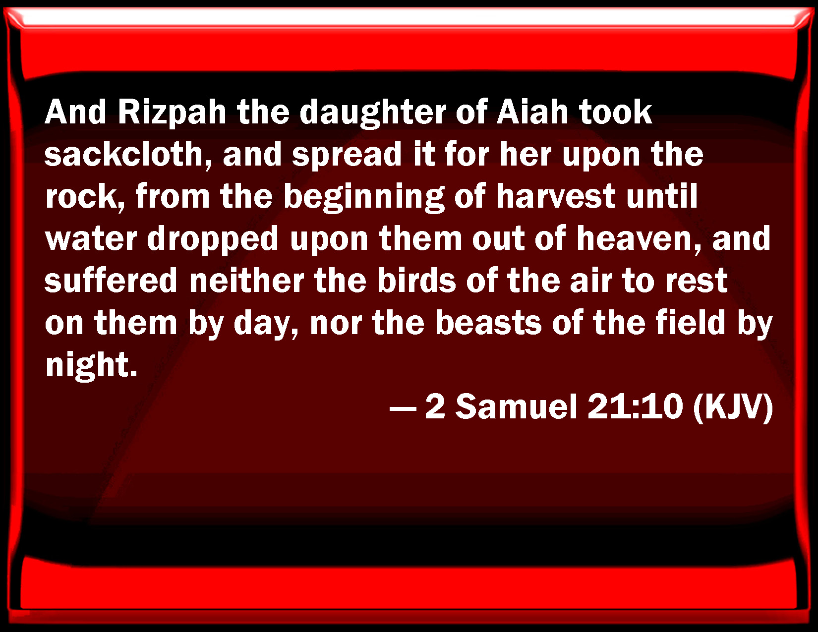 Bible Verse Slide 2 Samuel 21:10 And Rizpah the daughter of Aiah took sackcloth, and spread it for her on the rock, from the beginning of harvest until water dropped on them out of heaven, and suffered neither the birds of the air to rest on them by day, nor the beasts of the field by night. KJV: And Rizpah the daughter of Aiah took sackcloth, and spread it for her upon the rock, from the beginning of harvest until water dropped upon them out of heaven, and suffered neither the birds of the air to rest on them by day, nor the beasts of the field by night. DRB: And Respha the daughter of Aia took haircloth, and spread it under her upon the rock from the beginning of the harvest, till water dropped upon them out of heaven: and suffered neither the birds to tear them by day, nor the beasts by night. DBT: Then Rizpah the daughter of Aiah took sackcloth, and spread it for her upon the rock, from the beginning of harvest until water poured on them out of the heavens, and suffered neither the fowl of the heavens to rest on them by day, nor the beasts of the field by night. ERV: And Rizpah the daughter of Aiah took sackcloth, and spread it for her upon the rock, from the beginning of harvest until water was poured upon them from heaven; and she suffered neither the birds of the air to rest on them by day, nor the beasts of the field by night. WBT: And Rizpah the daughter of Aiah took sackcloth, and spread it for her upon the rock, from the beginning of harvest until water dropped upon them out of heaven, and suffered neither the birds of the air to rest on them by day, nor the beasts of the field by night. WEB: Rizpah the daughter of Aiah took sackcloth, and spread it for her on the rock, from the beginning of harvest until water was poured on them from the sky. She allowed neither the birds of the sky to rest on them by day, nor the animals of the field by night. YLT: And Rizpah daughter of Aiah taketh the sackcloth, and stretcheth it out for herself on the rock, from the commencement of harvest till water hath been poured out upon them from the heavens, and hath not suffered a fowl of the heavens to rest upon them by day, or the beast of the field by night.Links 2 Samuel 21:10 NIV • 2 Samuel 21:10 NLT • 2 Samuel 21:10 ESV • 2 Samuel 21:10 NASB • 2 Samuel 21:10 KJV • 2 Samuel 21:10 Interlinear • 2 Samuel 21:10 Commentaries • 2 Samuel 21:10 Parallel Texts • 2 Samuel 21:10 Bible Apps • 2 Samuel 21:10 Parallel • Bible Hub |