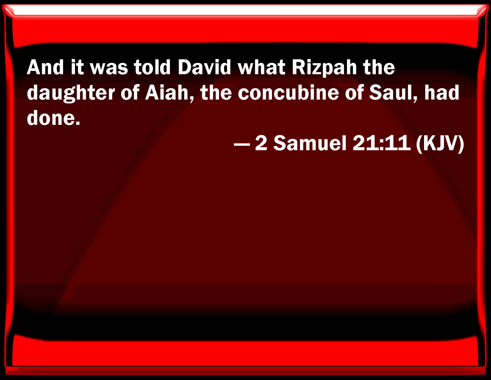 Bible Verse Slide 2 Samuel 21:11 And it was told David what Rizpah the daughter of Aiah, the concubine of Saul, had done. KJV: And it was told David what Rizpah the daughter of Aiah, the concubine of Saul, had done. DRB: And it was told David, what Respha the daughter of Aia, the concubine of Saul, had done. DBT: And it was told David what Rizpah the daughter of Aiah, the concubine of Saul, had done. ERV: And it was told David what Rizpah the daughter of Aiah, the concubine of Saul, had done. WBT: And it was told David what Rizpah the daughter of Aiah the concubine of Saul had done. WEB: It was told David what Rizpah the daughter of Aiah, the concubine of Saul, had done. YLT: And it is declared to David that which Rizpah daughter of Aiah, concubine of Saul, hath done,Links 2 Samuel 21:11 NIV • 2 Samuel 21:11 NLT • 2 Samuel 21:11 ESV • 2 Samuel 21:11 NASB • 2 Samuel 21:11 KJV • 2 Samuel 21:11 Interlinear • 2 Samuel 21:11 Commentaries • 2 Samuel 21:11 Parallel Texts • 2 Samuel 21:11 Bible Apps • 2 Samuel 21:11 Parallel • Bible Hub |