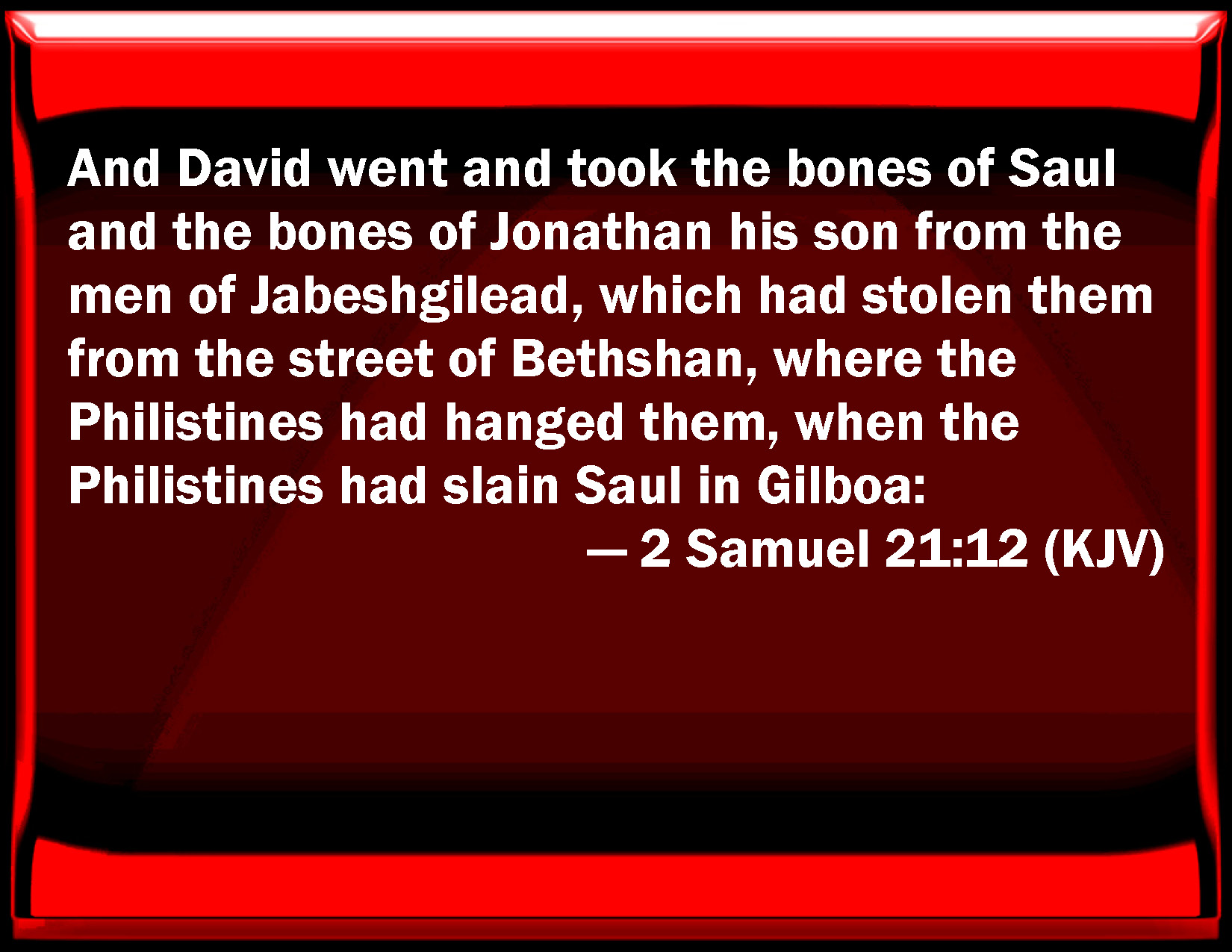 Bible Verse Slide 2 Samuel 21:12 And David went and took the bones of Saul and the bones of Jonathan his son from the men of Jabeshgilead, which had stolen them from the street of Bethshan, where the Philistines had hanged them, when the Philistines had slain Saul in Gilboa: KJV: And David went and took the bones of Saul and the bones of Jonathan his son from the men of Jabeshgilead, which had stolen them from the street of Bethshan, where the Philistines had hanged them, when the Philistines had slain Saul in Gilboa: DRB: And David went, and took the bones of Saul, and the bones of Jonathan his son from the men of Jabes Galaad, who had stolen them from the street of Bethsan, where the Philistines had hanged them when they had slain Saul in Gelboe. DBT: And David went and took the bones of Saul and the bones of Jonathan his son from the men of Jabesh-Gilead, who had stolen them from the open place of Beth-shan, where the Philistines had hanged them, the day the Philistines had smitten Saul in Gilboa; ERV: And David went and took the bones of Saul and the bones of Jonathan his son from the men of Jabesh-gilead, which had stolen them from the street of Beth-shan, where the Philistines had hanged them, in the day that the Philistines slew Saul in Gilboa: WBT: And David went and took the bones of Saul and the bones of Jonathan his son from the men of Jabesh-gilead, who had stolen them from the street of Beth-shan, where the Philistines had hanged them, when the Philistines had slain Saul in Gilboa: WEB: David went and took the bones of Saul and the bones of Jonathan his son from the men of Jabesh Gilead, who had stolen them from the street of Beth Shan, where the Philistines had hanged them, in the day that the Philistines killed Saul in Gilboa; YLT: and David goeth and taketh the bones of Saul, and the bones of Jonathan his son, from the possessors of Jabesh-Gilead, who had stolen them from the broad place of Beth-Shan, where the Philistines hanged them, in the day of the Philistines smiting Saul in Gilboa;Links 2 Samuel 21:12 NIV • 2 Samuel 21:12 NLT • 2 Samuel 21:12 ESV • 2 Samuel 21:12 NASB • 2 Samuel 21:12 KJV • 2 Samuel 21:12 Interlinear • 2 Samuel 21:12 Commentaries • 2 Samuel 21:12 Parallel Texts • 2 Samuel 21:12 Bible Apps • 2 Samuel 21:12 Parallel • Bible Hub |