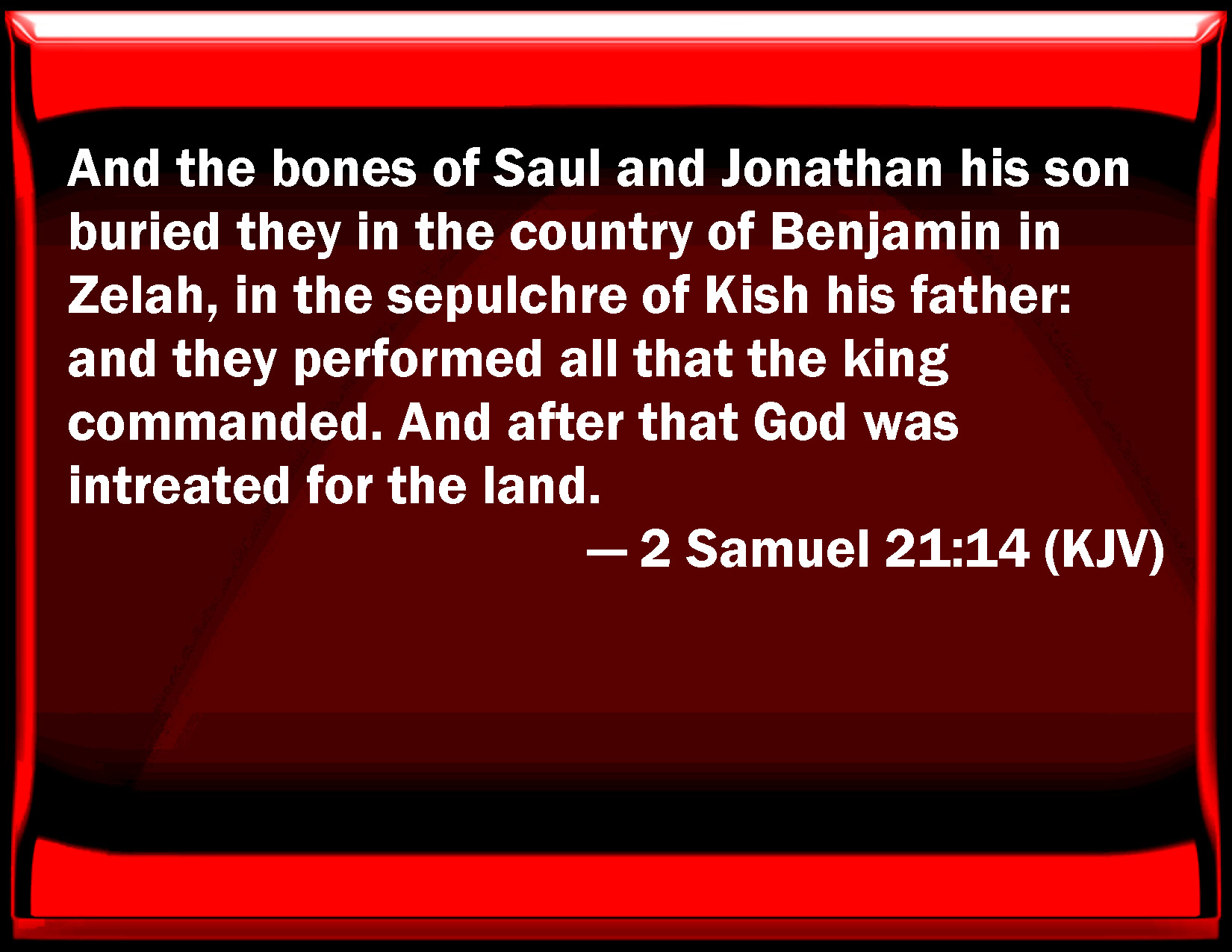 Bible Verse Slide 2 Samuel 21:14 And the bones of Saul and Jonathan his son buried they in the country of Benjamin in Zelah, in the sepulcher of Kish his father: and they performed all that the king commanded. And after that God was entreated for the land. KJV: And the bones of Saul and Jonathan his son buried they in the country of Benjamin in Zelah, in the sepulchre of Kish his father: and they performed all that the king commanded. And after that God was intreated for the land. DRB: And they buried them with the bones of Saul, and of Jonathan his son in the land of Benjamin, in the side, in the sepulchre of Cis his father: and they did all that the king had commanded, and God shewed mercy again to the land after these things. DBT: And they buried them with the bones of Saul and Jonathan his son in the country of Benjamin in Zela, in the sepulchre of Kish his father; and they did all that the king had commanded. And afterwards God was propitious to the land. ERV: And they buried the bones of Saul and Jonathan his son in the country of Benjamin in Zela, in the sepulchre of Kish his father: and they performed all that the king commanded. And after that God was entreated for the land. WBT: And the bones of Saul and Jonathan his son they buried in the country of Benjamin in Zelah, in the sepulcher of Kish his father: and they performed all that the king commanded. And after that God was entreated for the land. WEB: They buried the bones of Saul and Jonathan his son in the country of Benjamin in Zela, in the tomb of Kish his father: and they performed all that the king commanded. After that God was entreated for the land. YLT: and bury the bones of Saul and of Jonathan his son in the land of Benjamin, in Zelah, in the burying-place of Kish his father, and do all that the king commanded, and God is entreated for the land afterwards.Links 2 Samuel 21:14 NIV • 2 Samuel 21:14 NLT • 2 Samuel 21:14 ESV • 2 Samuel 21:14 NASB • 2 Samuel 21:14 KJV • 2 Samuel 21:14 Interlinear • 2 Samuel 21:14 Commentaries • 2 Samuel 21:14 Parallel Texts • 2 Samuel 21:14 Bible Apps • 2 Samuel 21:14 Parallel • Bible Hub |