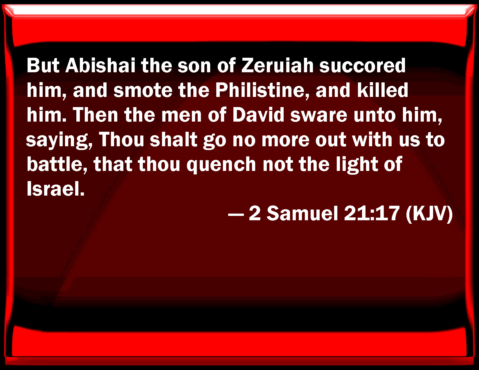 Bible Verse Slide 2 Samuel 21:17 But Abishai the son of Zeruiah succored him, and smote the Philistine, and killed him. Then the men of David swore to him, saying, You shall go no more out with us to battle, that you quench not the light of Israel. KJV: But Abishai the son of Zeruiah succoured him, and smote the Philistine, and killed him. Then the men of David sware unto him, saying, Thou shalt go no more out with us to battle, that thou quench not the light of Israel. DRB: And Abisai the son of Sarvia rescued him, and striking the Philistine killed him. Then David's men swore unto him, saying: Thou shalt go no more out with us to battle, lest thou put out the lamp of Israel. DBT: And Abishai the son of Zeruiah succoured him, and smote the Philistine and killed him. Then the men of David swore to him, saying, Thou shalt go no more out with us to battle, that thou quench not the lamp of Israel. ERV: But Abishai the son of Zeruiah succoured him, and smote the Philistine, and killed him. Then the men of David sware unto him, saying, Thou shalt go no more out with us to battle, that thou quench not the lamp of Israel. WBT: But Abishai the son of Zeruiah succored him, and smote the Philistine, and killed him. Then the men of David swore to him, saying, Thou shalt go out no more with us to battle, that thou mayest not extinguish the light of Israel. WEB: But Abishai the son of Zeruiah helped him, and struck the Philistine, and killed him. Then the men of David swore to him, saying, "You shall go no more out with us to battle, that you don't quench the lamp of Israel." YLT: and Abishai son of Zeruiah giveth help to him, and smiteth the Philistine, and putteth him to death; then swear the men of David to him, saying, 'Thou dost not go out again with us to battle, nor quench the lamp of Israel.'Links 2 Samuel 21:17 NIV • 2 Samuel 21:17 NLT • 2 Samuel 21:17 ESV • 2 Samuel 21:17 NASB • 2 Samuel 21:17 KJV • 2 Samuel 21:17 Interlinear • 2 Samuel 21:17 Commentaries • 2 Samuel 21:17 Parallel Texts • 2 Samuel 21:17 Bible Apps • 2 Samuel 21:17 Parallel • Bible Hub |