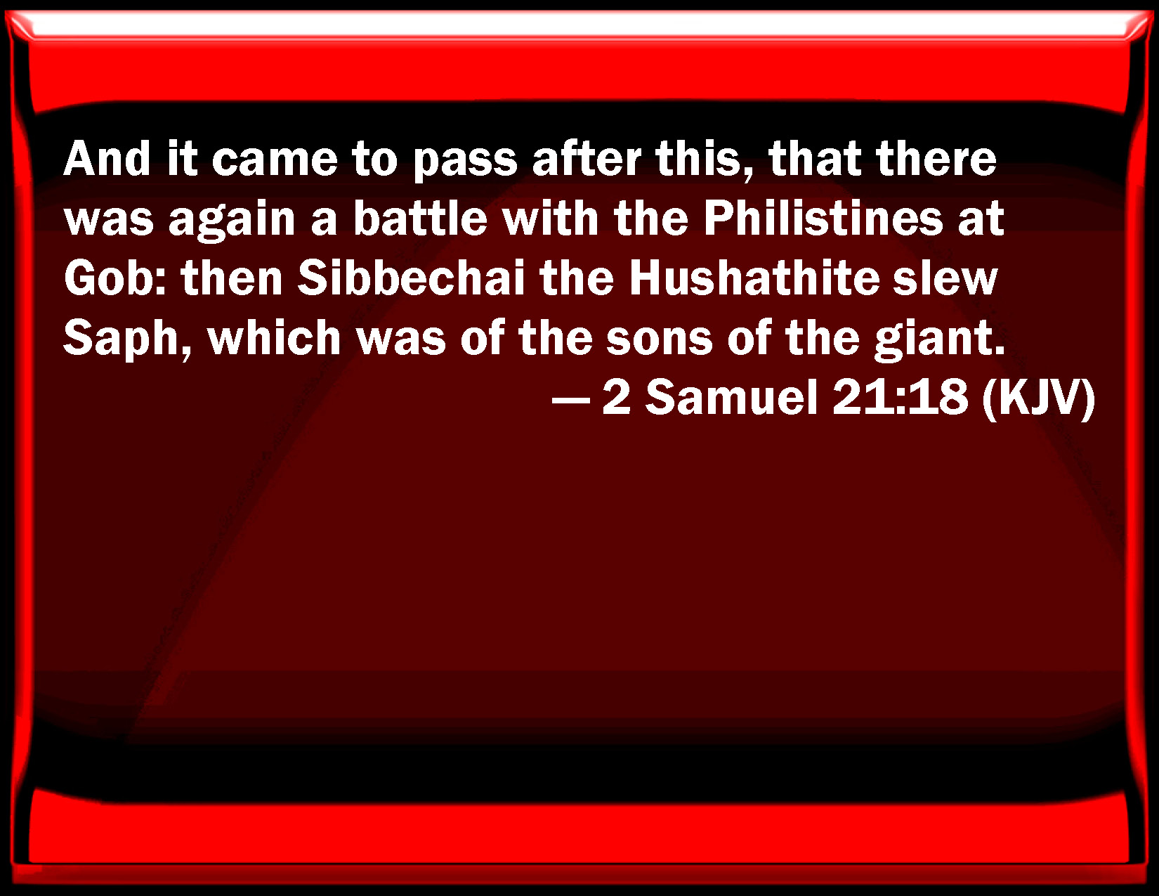 Bible Verse Slide 2 Samuel 21:18 And it came to pass after this, that there was again a battle with the Philistines at Gob: then Sibbechai the Hushathite slew Saph, which was of the sons of the giant. KJV: And it came to pass after this, that there was again a battle with the Philistines at Gob: then Sibbechai the Hushathite slew Saph, which was of the sons of the giant. DRB: There was also a second battle in Gob against the Philistines: then Sobochai of Husathi slew Saph of the race of Arapha of the family of the giants. DBT: And it came to pass after this, that there was again a battle with the Philistines, at Gob; then Sibbechai the Hushathite smote Saph, who was of the children of Raphah. ERV: And it came to pass after this, that there was again war with the Philistines at Gob: then Sibbecai the Hushathite slew Saph, which was of the sons of the giant. WBT: And it came to pass after this, that there was again a battle with the Philistines at Gob: then Sibbechai the Hushathite slew Saph, who was of the sons of the giant. WEB: It came to pass after this, that there was again war with the Philistines at Gob: then Sibbecai the Hushathite killed Saph, who was of the sons of the giant. YLT: And it cometh to pass afterwards, that the battle is again in Gob with the Philistines, then hath Sibbechai the Hushathite smitten Saph, who is among the children of the giant.Links 2 Samuel 21:18 NIV • 2 Samuel 21:18 NLT • 2 Samuel 21:18 ESV • 2 Samuel 21:18 NASB • 2 Samuel 21:18 KJV • 2 Samuel 21:18 Interlinear • 2 Samuel 21:18 Commentaries • 2 Samuel 21:18 Parallel Texts • 2 Samuel 21:18 Bible Apps • 2 Samuel 21:18 Parallel • Bible Hub |