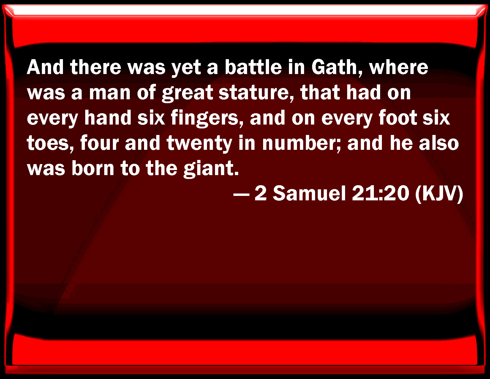 Bible Verse Slide 2 Samuel 21:20 And there was yet a battle in Gath, where was a man of great stature, that had on every hand six fingers, and on every foot six toes, four and twenty in number; and he also was born to the giant. KJV: And there was yet a battle in Gath, where was a man of great stature, that had on every hand six fingers, and on every foot six toes, four and twenty in number; and he also was born to the giant. DRB: A fourth battle was in Geth. where there was a man of great stature, that had six fingers on each hand, and six toes on each foot, four and twenty in all, and he was of the race of Arapha. DBT: And there was again a battle, at Gath; and there was a man there of great stature, that had on each hand six fingers, and on each foot six toes, four and twenty in number; and he also was born to Raphah. ERV: And there was again war at Gath, where was a man of great stature, that had on every hand six fingers, and on every foot six toes, four and twenty in number; and he also was born to the giant. WBT: And there was yet a battle in Gath, where was a man of great stature, that had on every hand six fingers, and on every foot six toes, four and twenty in number; and he also was born to the giant. WEB: There was again war at Gath, where there was a man of great stature, who had on every hand six fingers, and on every foot six toes, four and twenty in number; and he also was born to the giant. YLT: And the battle is again in Gath, and there is a man of stature, and the fingers of his hands are six, and the toes of his feet are six, twenty and four in number, and he also hath been born to the giant,Links 2 Samuel 21:20 NIV • 2 Samuel 21:20 NLT • 2 Samuel 21:20 ESV • 2 Samuel 21:20 NASB • 2 Samuel 21:20 KJV • 2 Samuel 21:20 Interlinear • 2 Samuel 21:20 Commentaries • 2 Samuel 21:20 Parallel Texts • 2 Samuel 21:20 Bible Apps • 2 Samuel 21:20 Parallel • Bible Hub |